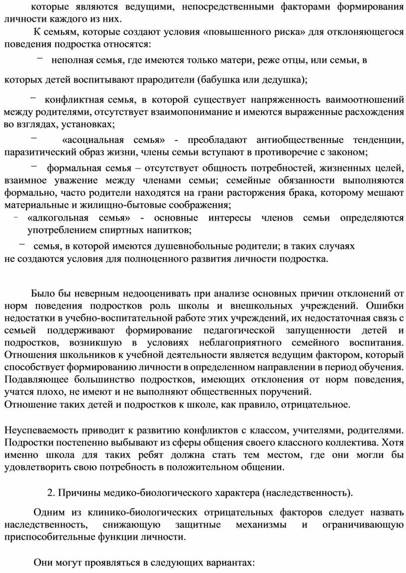 Этот фактор проявляется в недостаточности защитно-охранительных механизмов деятельности головного мозга и обнаруживается в самых разнообразных формах нервно-психической патологии (умственной недостаточности, нарушения формирования характера и др.). Наряду с влиянием наследственности, существенное значение имеет и биологическая неполноценность нервных клеток мозга, обусловленная такими неблагоприятными факторами, как тяжелые заболевания в первые годы жизни и травмы головного мозга, которые приводят к своеобразным особенностям темперамента и проявляются в эмоциональной неустойчивости подростков, в слабости защитных и приспособительных механизмов. Особую роль в возникновении нарушений поведения играют особенности подросткового возраста, который характеризуется бурным ростом организма, началом и завершением полового созревания, совершенствованием функции органов различных систем организма, в том числе и центральной нервной системы. Современные условия жизни оказывают на организм ребенка более интенсивное воздействие, чем полвека назад, темп жизни ускорился. Вместе с тем у подростка сохраняются детские интересы, эмоциональная неустойчивость, незрелость гражданских понятий и представлений. Возникает диспропорция между физическим развитием и социальной адаптацией. При неустойчивой нервной системе и еще не в сформировавшихся жизненных взглядах и убеждениях, подросток оказывается более восприимчивым к воздействию примеров негативного поведения.