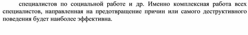 Деструктивное поведение несовершеннолетних требует незамедлительной работы специалистов различных областей: психологов, социальных педагогов, специалистов по социальной работе и др. Именно комплексная работа всех специалистов, направленная на предотвращение причин или самого деструктивного поведения будет наиболее эффективна.