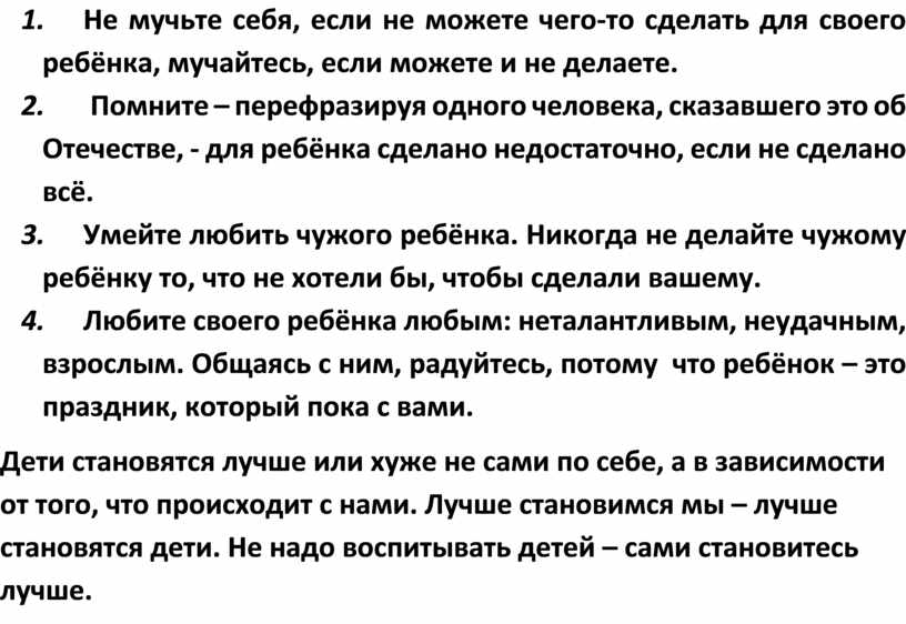 10. Дети становятся лучше или хуже не сами по себе, а в зависимости от того, что происходит с нами. Лучше становимся мы – лучше становятся дети. Не надо воспитывать детей – сами становитесь лучше.