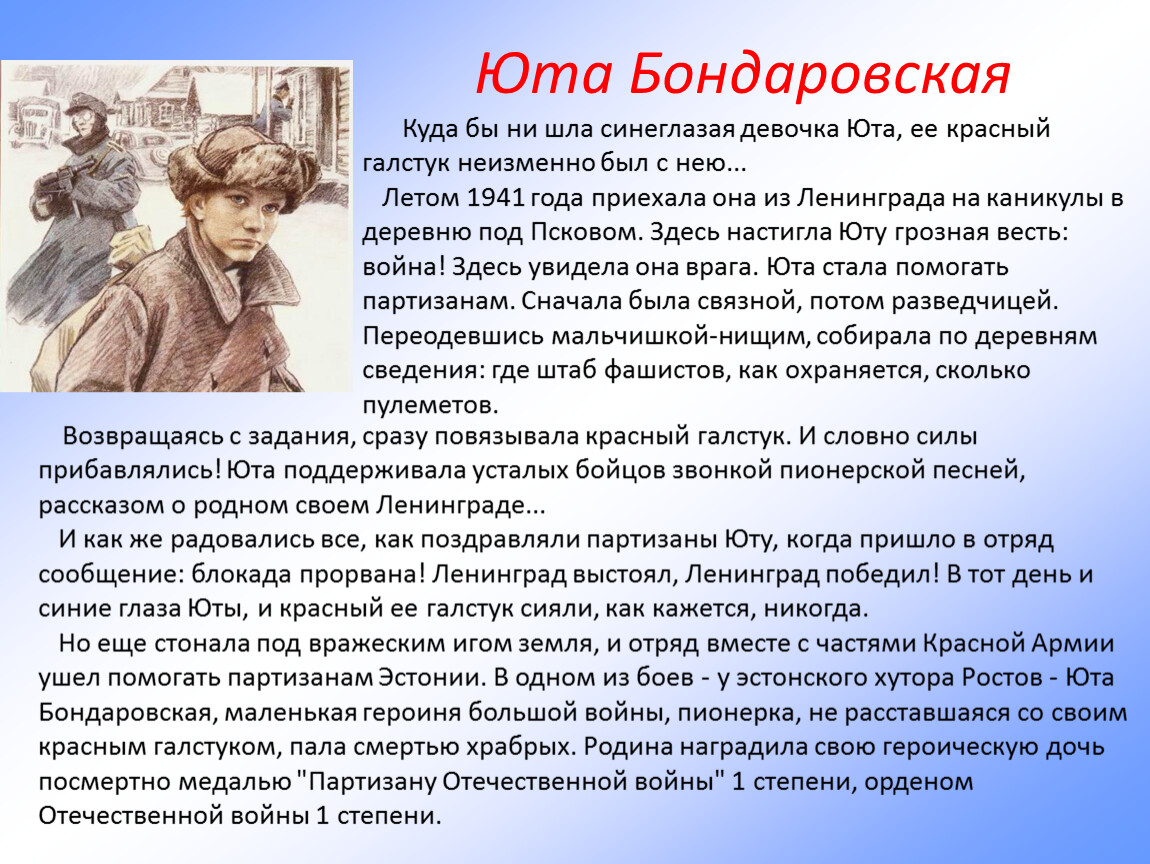Юта Бондаровская Куда бы ни шла синеглазая девочка Юта, ее красный галстук неизменно был с нею... Летом 1941 года приехала она из Ленинграда на каникулы в деревню под Псковом. Здесь настигла Юту грозная весть: война! Здесь увидела она врага. Юта стала помогать партизанам. Сначала была связной, потом разведчицей. Переодевшись мальчишкой-нищим, собирала по деревням сведения: где штаб фашистов, как охраняется, сколько пулеметов.