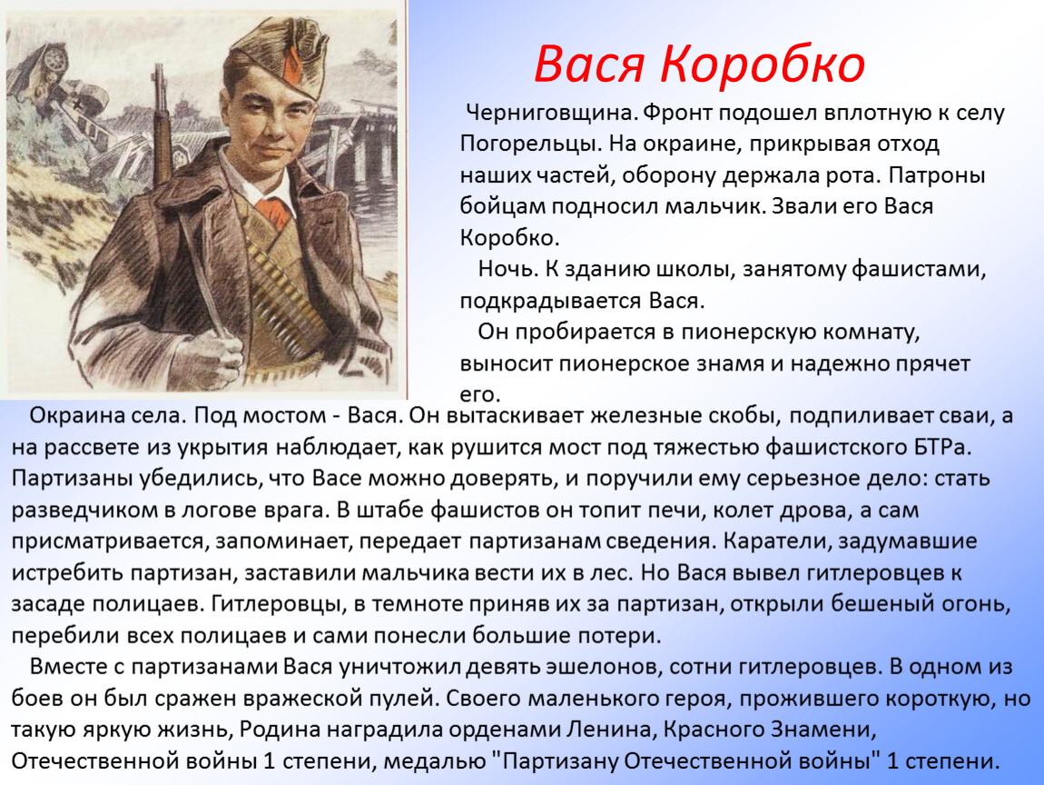 Окраина села. Под мостом - Вася. Он вытаскивает железные скобы, подпиливает сваи, а на рассвете из укрытия наблюдает, как рушится мост под тяжестью фашистского БТРа. Партизаны убедились, что Васе можно доверять, и поручили ему серьезное дело: стать разведчиком в логове врага. В штабе фашистов он топит печи, колет дрова, а сам присматривается, запоминает, передает партизанам сведения. Каратели, задумавшие истребить партизан, заставили мальчика вести их в лес. Но Вася вывел гитлеровцев к засаде полицаев. Гитлеровцы, в темноте приняв их за партизан, открыли бешеный огонь, перебили всех полицаев и сами понесли большие потери. Вместе с партизанами Вася уничтожил девять эшелонов, сотни гитлеровцев. В одном из боев он был сражен вражеской пулей. Своего маленького героя, прожившего короткую, но такую яркую жизнь, Родина наградила орденами Ленина, Красного Знамени, Отечественной войны 1 степени, медалью "Партизану Отечественной войны" 1 степени.