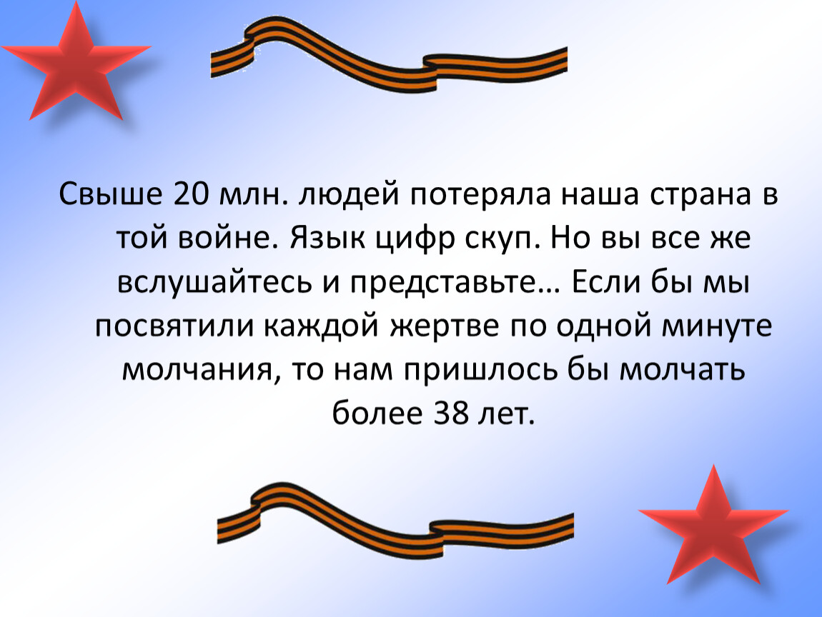 Свыше 20 млн. людей потеряла наша страна в той войне. Язык цифр скуп. Но вы все же вслушайтесь и представьте… Если бы мы посвятили каждой жертве по одной минуте молчания, то нам пришлось бы молчать более 38 лет.