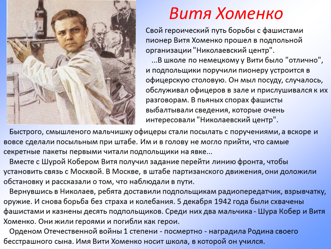 Свой героический путь борьбы с фашистами пионер Витя Хоменко прошел в подпольной организации "Николаевский центр". ...В школе по немецкому у Вити было "отлично", и подпольщики поручили пионеру устроится в офицерскую столовую. Он мыл посуду, случалось, обслуживал офицеров в зале и прислушивался к их разговорам. В пьяных спорах фашисты выбалтывали сведения, которые очень интересовали "Николаевский центр".
