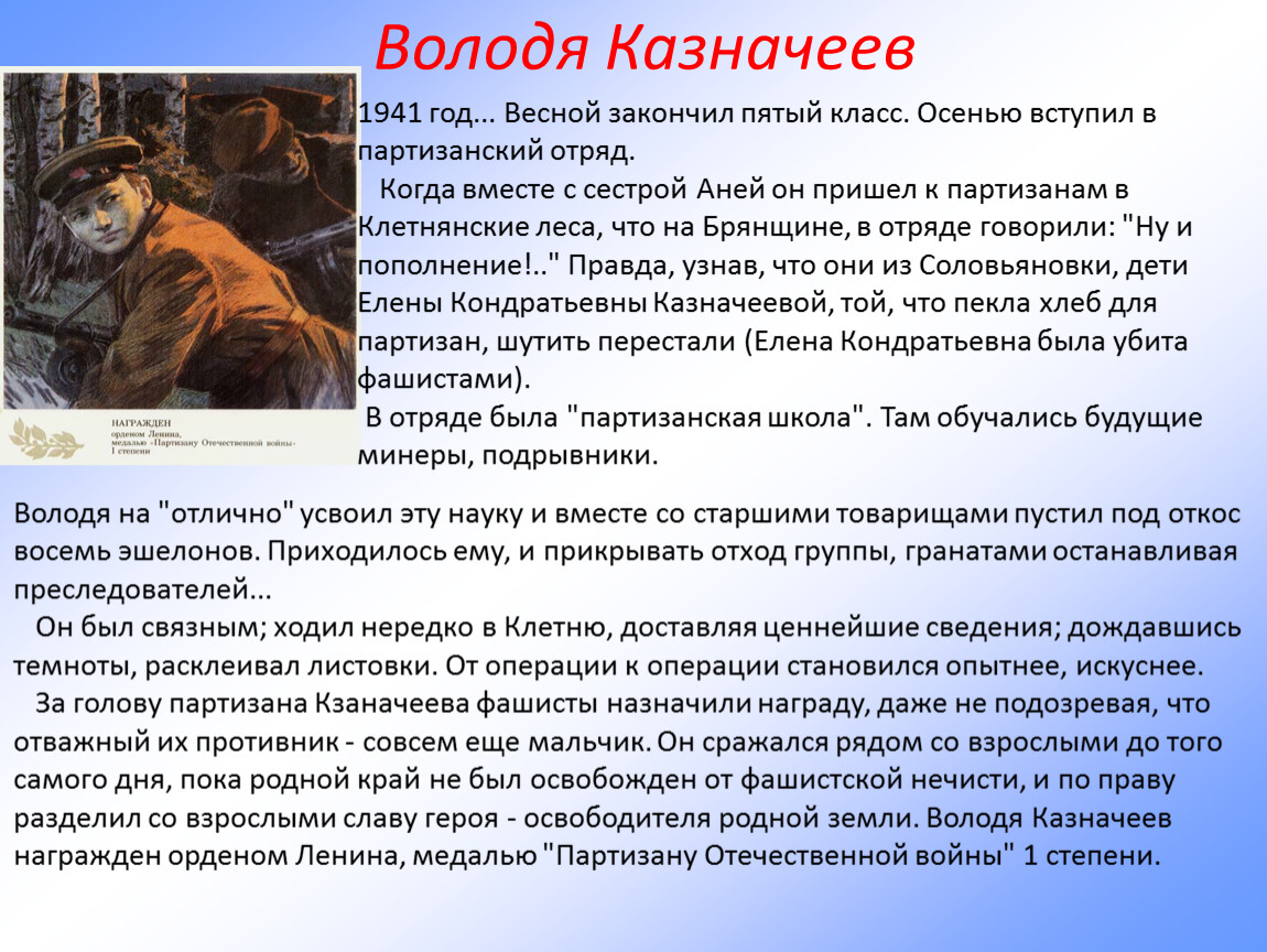 Володя на "отлично" усвоил эту науку и вместе со старшими товарищами пустил под откос восемь эшелонов. Приходилось ему, и прикрывать отход группы, гранатами останавливая преследователей... Он был связным; ходил нередко в Клетню, доставляя ценнейшие сведения; дождавшись темноты, расклеивал листовки. От операции к операции становился опытнее, искуснее. За голову партизана Кзаначеева фашисты назначили награду, даже не подозревая, что отважный их противник - совсем еще мальчик. Он сражался рядом со взрослыми до того самого дня, пока родной край не был освобожден от фашистской нечисти, и по праву разделил со взрослыми славу героя - освободителя родной земли. Володя Казначеев награжден орденом Ленина, медалью "Партизану Отечественной войны" 1 степени.