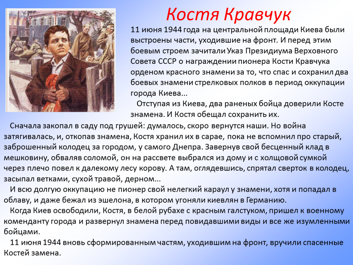 11 июня 1944 года на центральной площади Киева были выстроены части, уходившие на фронт. И перед этим боевым строем зачитали Указ Президиума Верховного Совета СССР о награждении пионера Кости Кравчука орденом красного знамени за то, что спас и сохранил два боевых знамени стрелковых полков в период оккупации города Киева... Отступая из Киева, два раненых бойца доверили Косте знамена. И Костя обещал сохранить их.