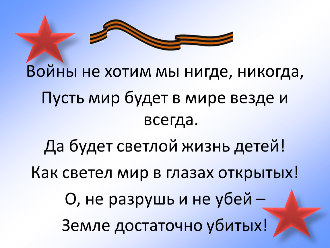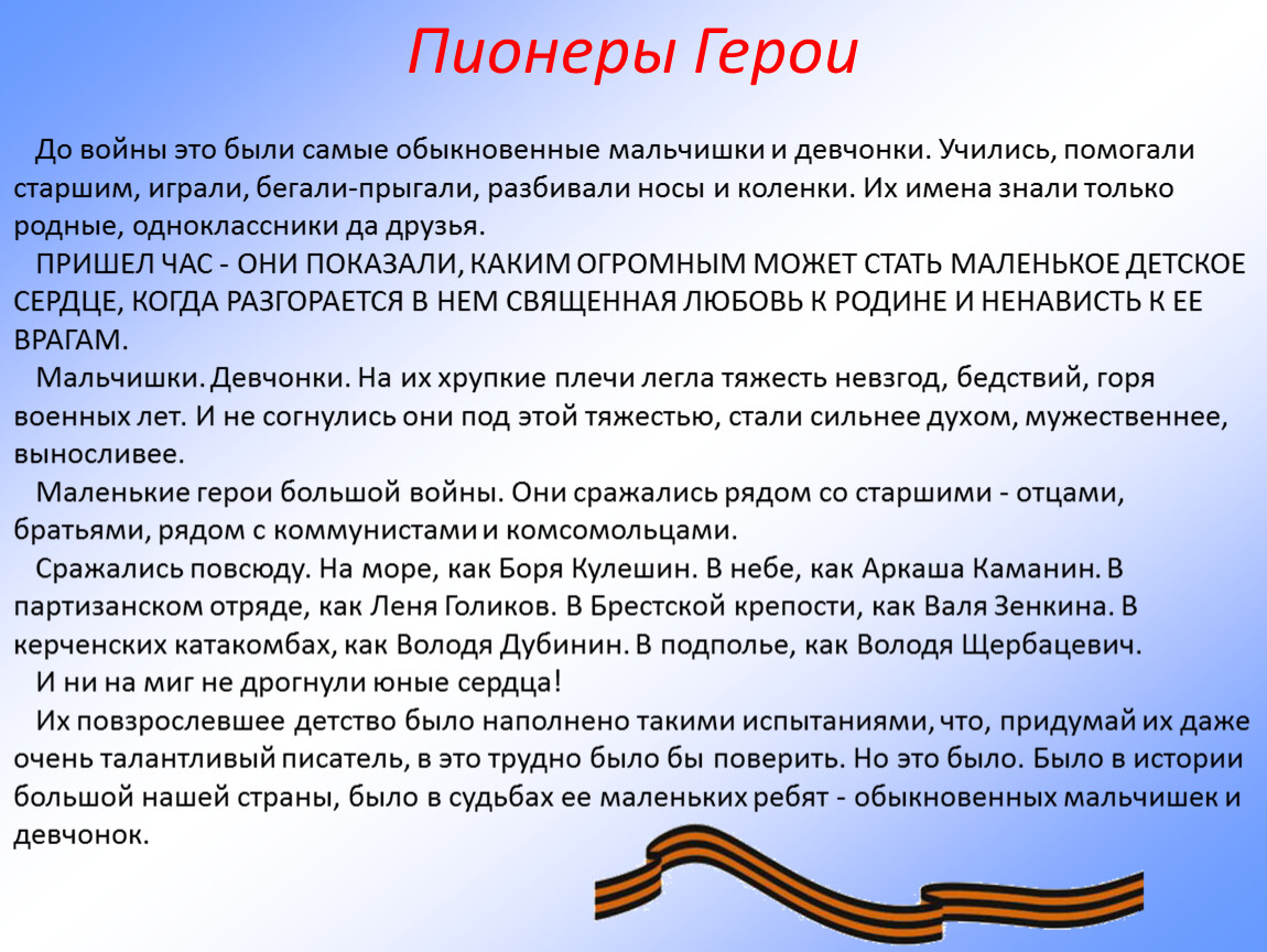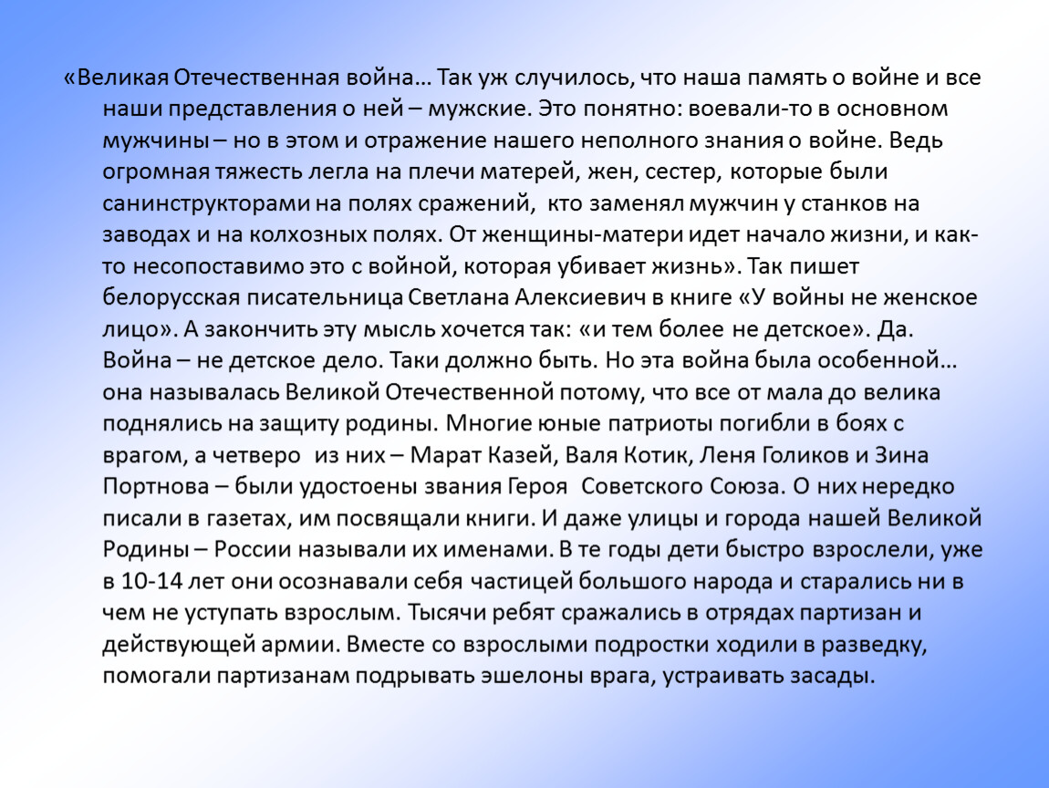 «Великая Отечественная война… Так уж случилось, что наша память о войне и все наши представления о ней – мужские. Это понятно: воевали-то в основном мужчины – но в этом и отражение нашего неполного знания о войне. Ведь огромная тяжесть легла на плечи матерей, жен, сестер, которые были санинструкторами на полях сражений, кто заменял мужчин у станков на заводах и на колхозных полях. От женщины-матери идет начало жизни, и как-то несопоставимо это с войной, которая убивает жизнь». Так пишет белорусская писательница Светлана Алексиевич в книге «У войны не женское лицо». А закончить эту мысль хочется так: «и тем более не детское». Да. Война – не детское дело. Таки должно быть. Но эта война была особенной… она называлась Великой Отечественной потому, что все от мала до велика поднялись на защиту родины. Многие юные патриоты погибли в боях с врагом, а четверо из них – Марат Казей, Валя Котик, Леня Голиков и Зина Портнова – были удостоены звания Героя Советского Союза. О них нередко писали в газетах, им посвящали книги. И даже улицы и города нашей Великой Родины – России называли их именами. В те годы дети быстро взрослели, уже в 10-14 лет они осознавали себя частицей большого народа и старались ни в чем не уступать взрослым. Тысячи ребят сражались в отрядах партизан и действующей армии. Вместе со взрослыми подростки ходили в разведку, помогали партизанам подрывать эшелоны врага, устраивать засады.