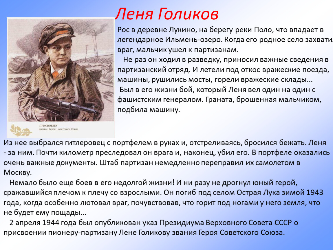 Из нее выбрался гитлеровец с портфелем в руках и, отстреливаясь, бросился бежать. Леня - за ним. Почти километр преследовал он врага и, наконец, убил его. В портфеле оказались очень важные документы. Штаб партизан немедленно переправил их самолетом в Москву. Немало было еще боев в его недолгой жизни! И ни разу не дрогнул юный герой, сражавшийся плечом к плечу со взрослыми. Он погиб под селом Острая Лука зимой 1943 года, когда особенно лютовал враг, почувствовав, что горит под ногами у него земля, что не будет ему пощады... 2 апреля 1944 года был опубликован указ Президиума Верховного Совета СССР о присвоении пионеру-партизану Лене Голикову звания Героя Советского Союза.