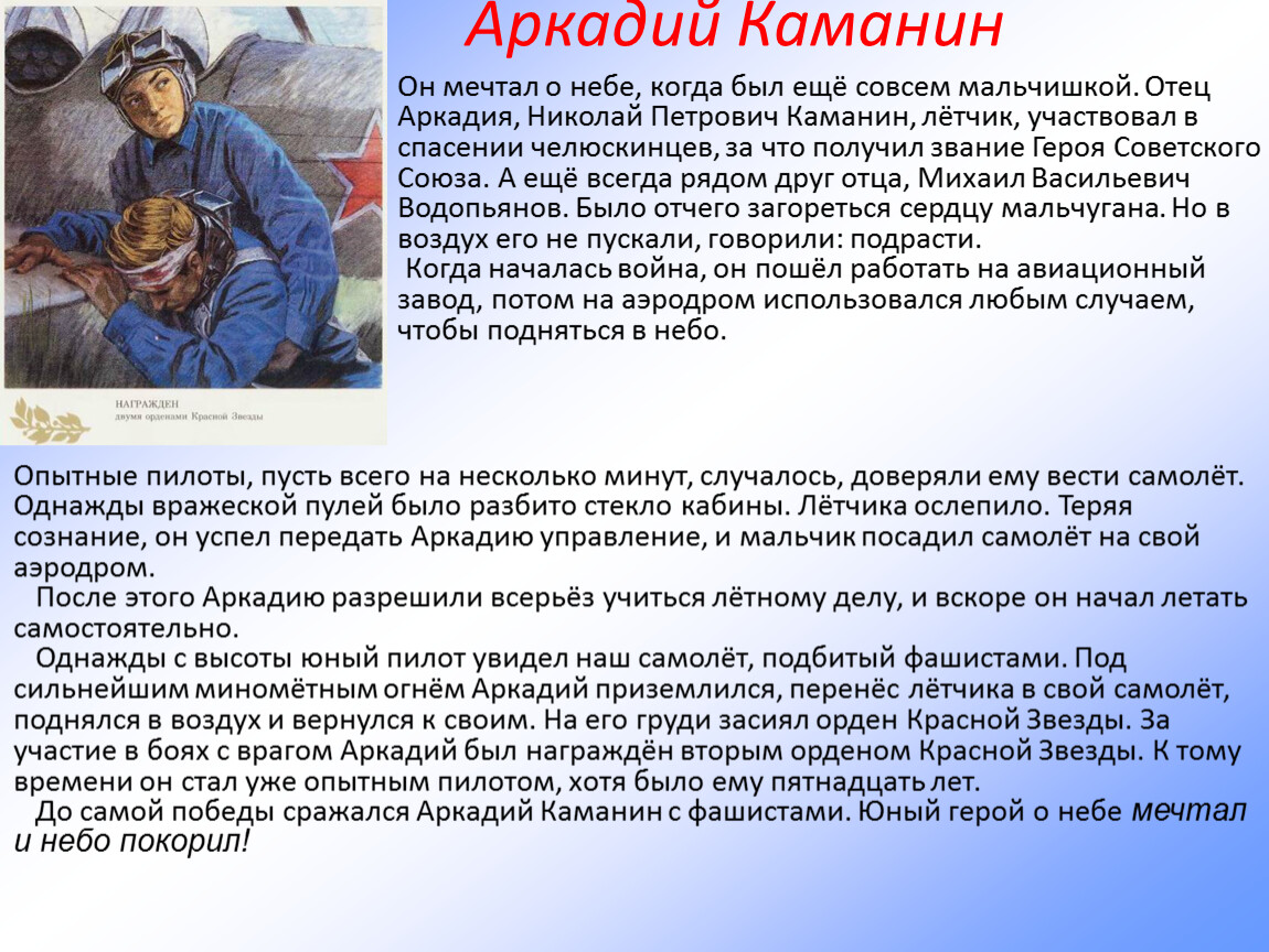 Опытные пилоты, пусть всего на несколько минут, случалось, доверяли ему вести самолёт. Однажды вражеской пулей было разбито стекло кабины. Лётчика ослепило. Теряя сознание, он успел передать Аркадию управление, и мальчик посадил самолёт на свой аэродром. После этого Аркадию разрешили всерьёз учиться лётному делу, и вскоре он начал летать самостоятельно. Однажды с высоты юный пилот увидел наш самолёт, подбитый фашистами. Под сильнейшим миномётным огнём Аркадий приземлился, перенёс лётчика в свой самолёт, поднялся в воздух и вернулся к своим. На его груди засиял орден Красной Звезды. За участие в боях с врагом Аркадий был награждён вторым орденом Красной Звезды. К тому времени он стал уже опытным пилотом, хотя было ему пятнадцать лет. До самой победы сражался Аркадий Каманин с фашистами. Юный герой о небе мечтал и небо покорил!