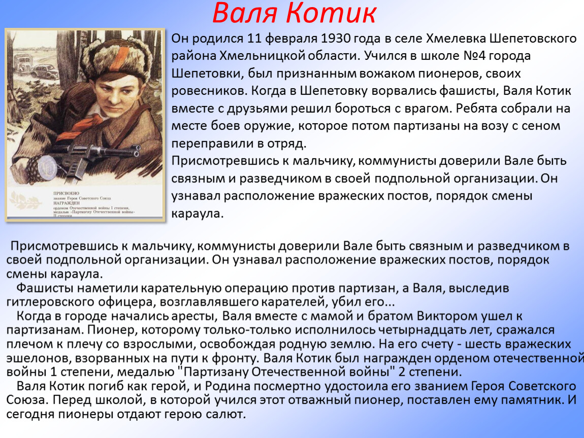Присмотревшись к мальчику, коммунисты доверили Вале быть связным и разведчиком в своей подпольной организации. Он узнавал расположение вражеских постов, порядок смены караула. Фашисты наметили карательную операцию против партизан, а Валя, выследив гитлеровского офицера, возглавлявшего карателей, убил его... Когда в городе начались аресты, Валя вместе с мамой и братом Виктором ушел к партизанам. Пионер, которому только-только исполнилось четырнадцать лет, сражался плечом к плечу со взрослыми, освобождая родную землю. На его счету - шесть вражеских эшелонов, взорванных на пути к фронту. Валя Котик был награжден орденом отечественной войны 1 степени, медалью "Партизану Отечественной войны" 2 степени. Валя Котик погиб как герой, и Родина посмертно удостоила его званием Героя Советского Союза. Перед школой, в которой учился этот отважный пионер, поставлен ему памятник. И сегодня пионеры отдают герою салют.