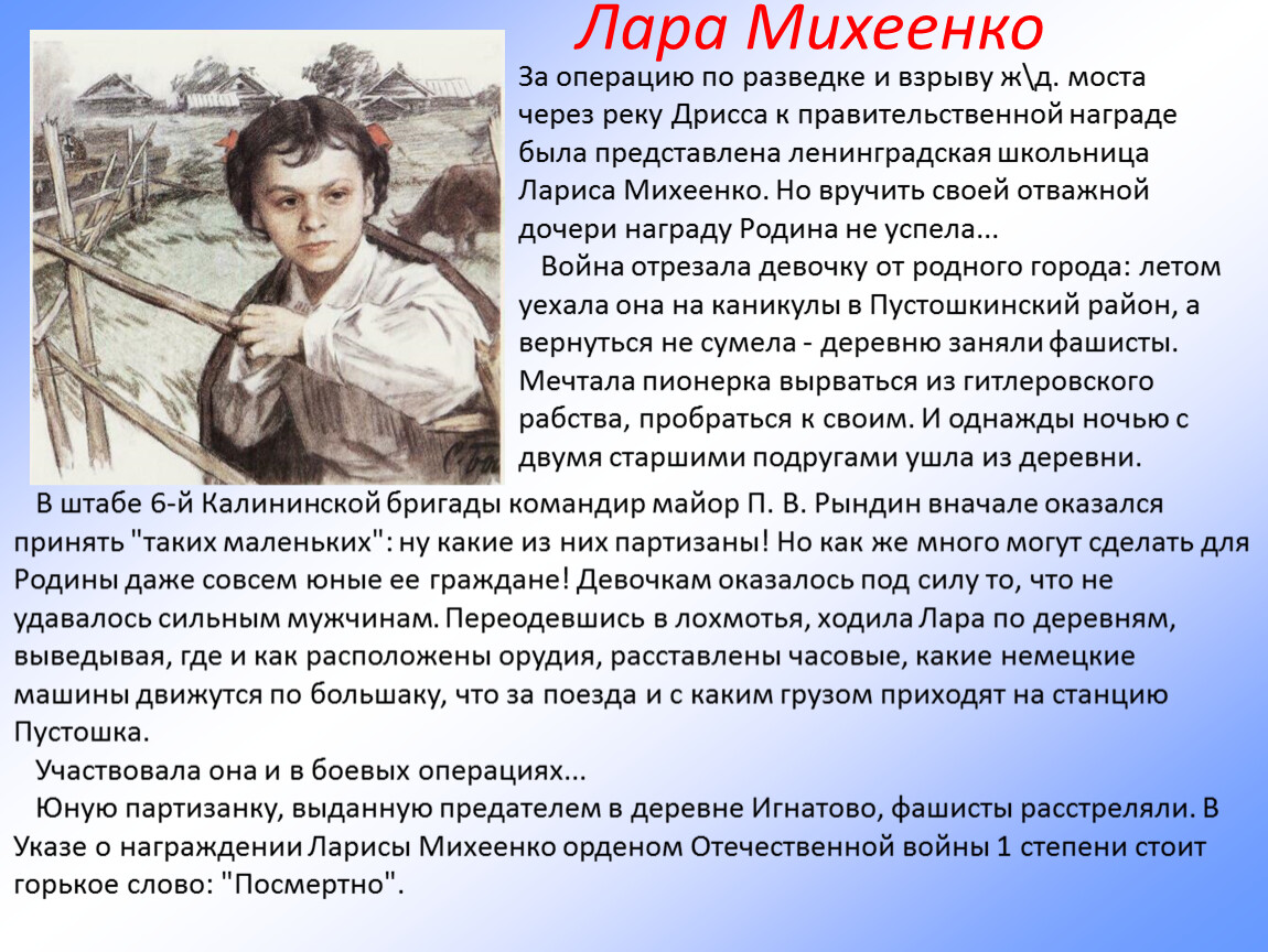 В штабе 6-й Калининской бригады командир майор П. В. Рындин вначале оказался принять "таких маленьких": ну какие из них партизаны! Но как же много могут сделать для Родины даже совсем юные ее граждане! Девочкам оказалось под силу то, что не удавалось сильным мужчинам. Переодевшись в лохмотья, ходила Лара по деревням, выведывая, где и как расположены орудия, расставлены часовые, какие немецкие машины движутся по большаку, что за поезда и с каким грузом приходят на станцию Пустошка. Участвовала она и в боевых операциях... Юную партизанку, выданную предателем в деревне Игнатово, фашисты расстреляли. В Указе о награждении Ларисы Михеенко орденом Отечественной войны 1 степени стоит горькое слово: "Посмертно".