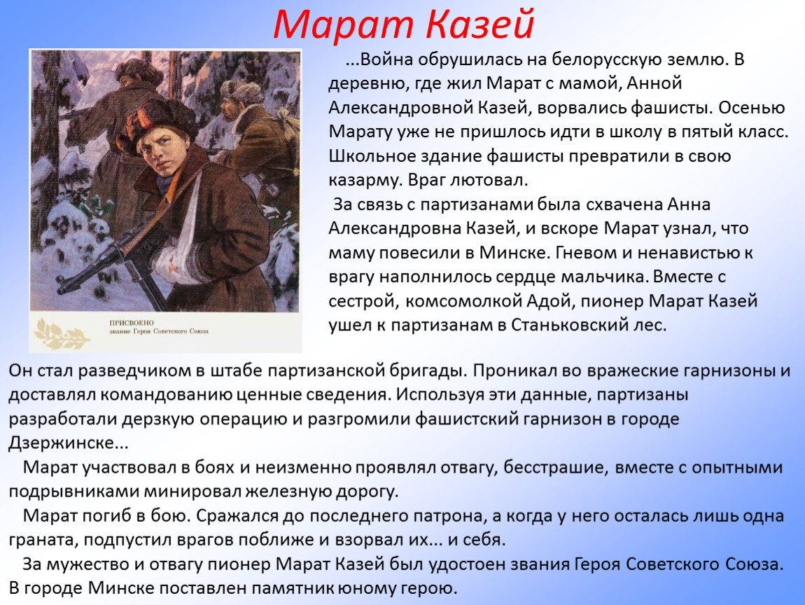 Он стал разведчиком в штабе партизанской бригады. Проникал во вражеские гарнизоны и доставлял командованию ценные сведения. Используя эти данные, партизаны разработали дерзкую операцию и разгромили фашистский гарнизон в городе Дзержинске... Марат участвовал в боях и неизменно проявлял отвагу, бесстрашие, вместе с опытными подрывниками минировал железную дорогу. Марат погиб в бою. Сражался до последнего патрона, а когда у него осталась лишь одна граната, подпустил врагов поближе и взорвал их... и себя. За мужество и отвагу пионер Марат Казей был удостоен звания Героя Советского Союза. В городе Минске поставлен памятник юному герою.