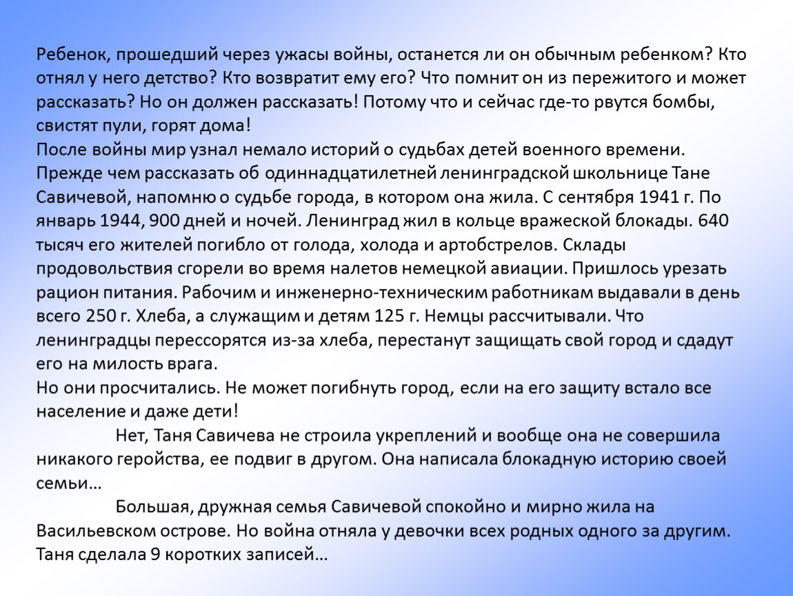 После войны мир узнал немало историй о судьбах детей военного времени. Прежде чем рассказать об одиннадцатилетней ленинградской школьнице Тане Савичевой, напомню о судьбе города, в котором она жила. С сентября 1941 г. По январь 1944, 900 дней и ночей. Ленинград жил в кольце вражеской блокады. 640 тысяч его жителей погибло от голода, холода и артобстрелов. Склады продовольствия сгорели во время налетов немецкой авиации. Пришлось урезать рацион питания. Рабочим и инженерно-техническим работникам выдавали в день всего 250 г. Хлеба, а служащим и детям 125 г. Немцы рассчитывали. Что ленинградцы перессорятся из-за хлеба, перестанут защищать свой город и сдадут его на милость врага.