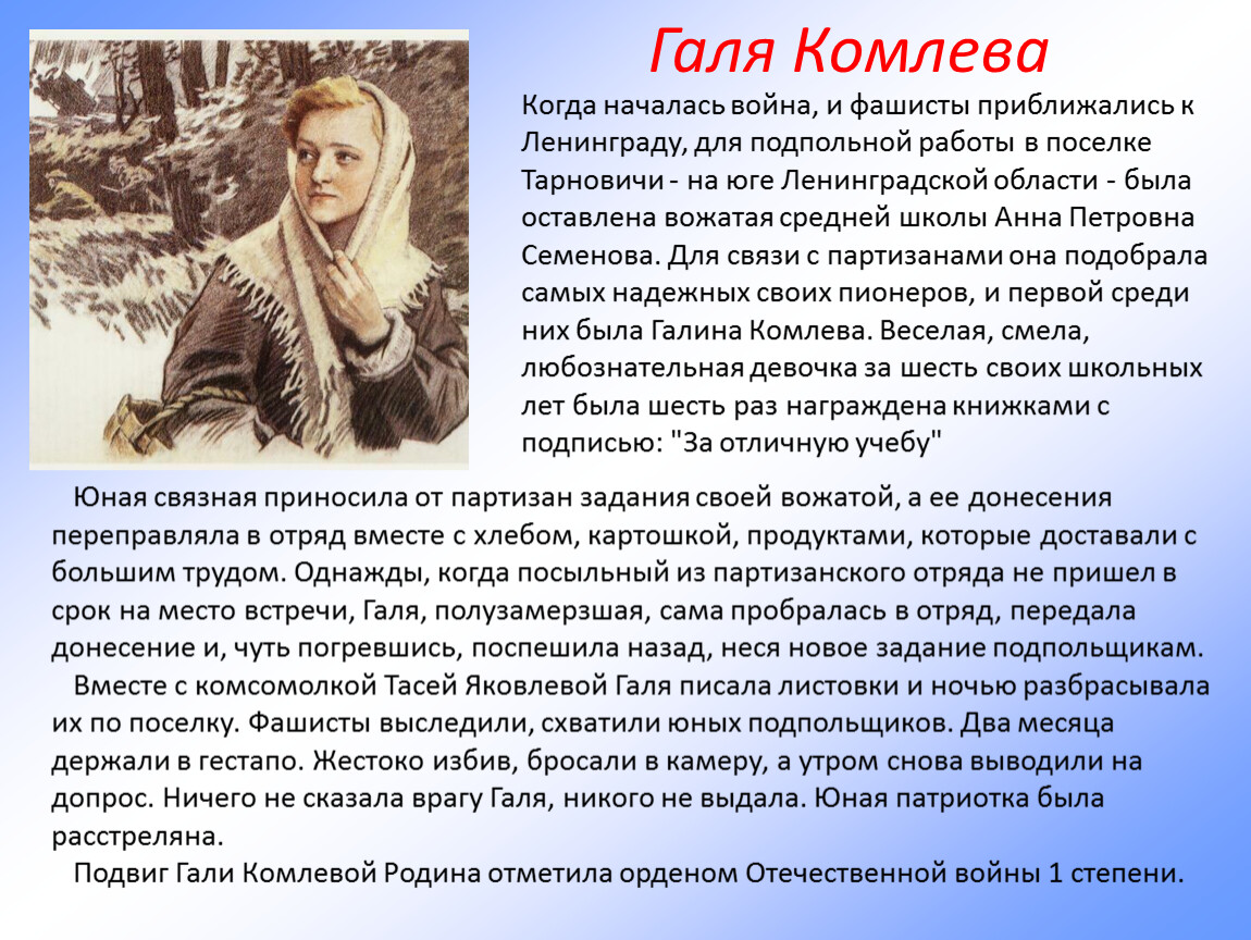 Когда началась война, и фашисты приближались к Ленинграду, для подпольной работы в поселке Тарновичи - на юге Ленинградской области - была оставлена вожатая средней школы Анна Петровна Семенова. Для связи с партизанами она подобрала самых надежных своих пионеров, и первой среди них была Галина Комлева. Веселая, смела, любознательная девочка за шесть своих школьных лет была шесть раз награждена книжками с подписью: "За отличную учебу"