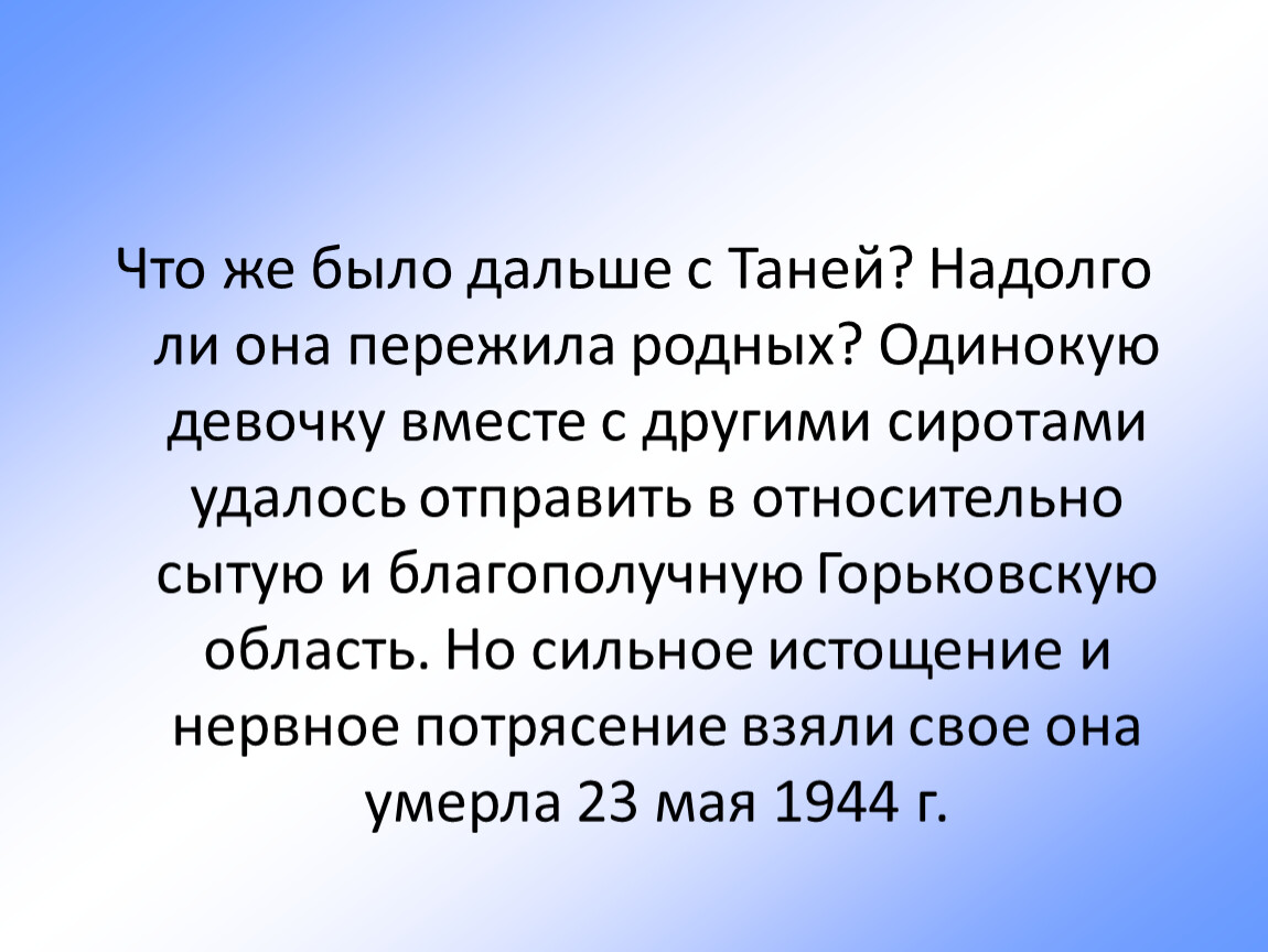 Что же было дальше с Таней? Надолго ли она пережила родных? Одинокую девочку вместе с другими сиротами удалось отправить в относительно сытую и благополучную Горьковскую область. Но сильное истощение и нервное потрясение взяли свое она умерла 23 мая 1944 г.