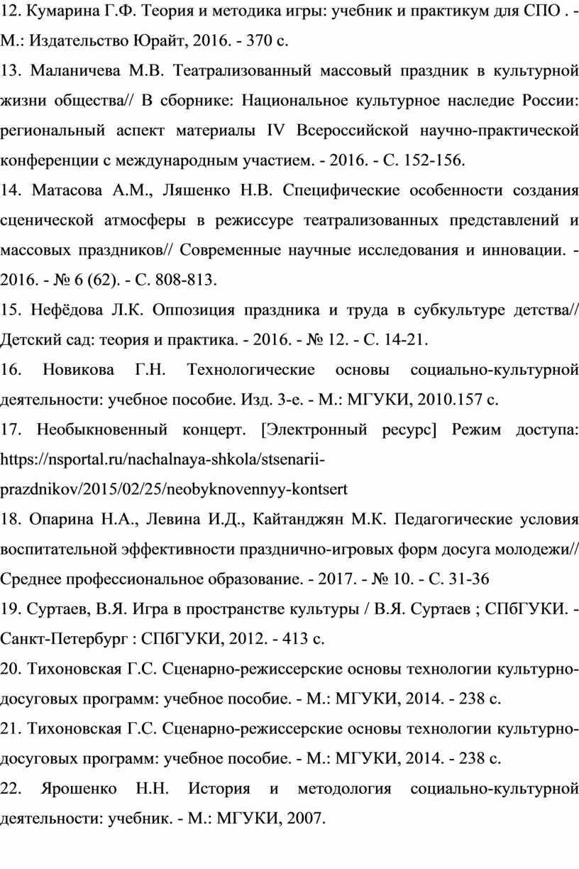 6. Жаркова А.А. Игра - выразительное средство культурно-досуговой деятельности: учебно-методическое пособие. - М.: МГИК, 2016. - 85 с.