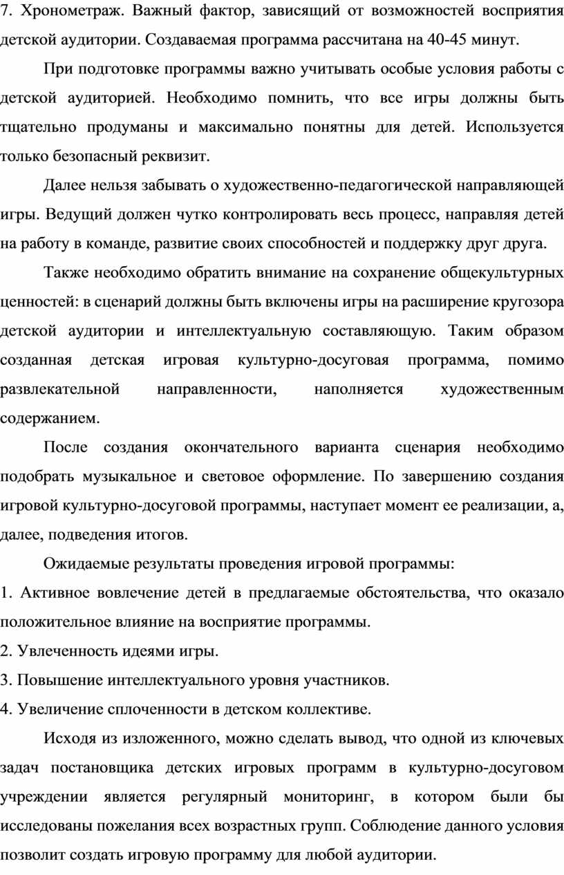 - произведено описание технологий создания игровой культурно-досуговой программы; определены основные этапы их подготовки и проведения. Материал второго параграфа позволил грамотно подойти к вопросу проектирования.