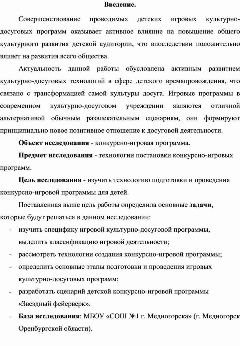 Актуальность данной работы обусловлена активным развитием культурно-досуговых технологий в сфере детского времяпровождения, что связано с трансформацией самой культуры досуга. Игровые программы в современном культурно-досуговом учреждении являются отличной альтернативой обычным развлекательным сценариям, они формируют принципиально новое позитивное отношение к досуговой деятельности.