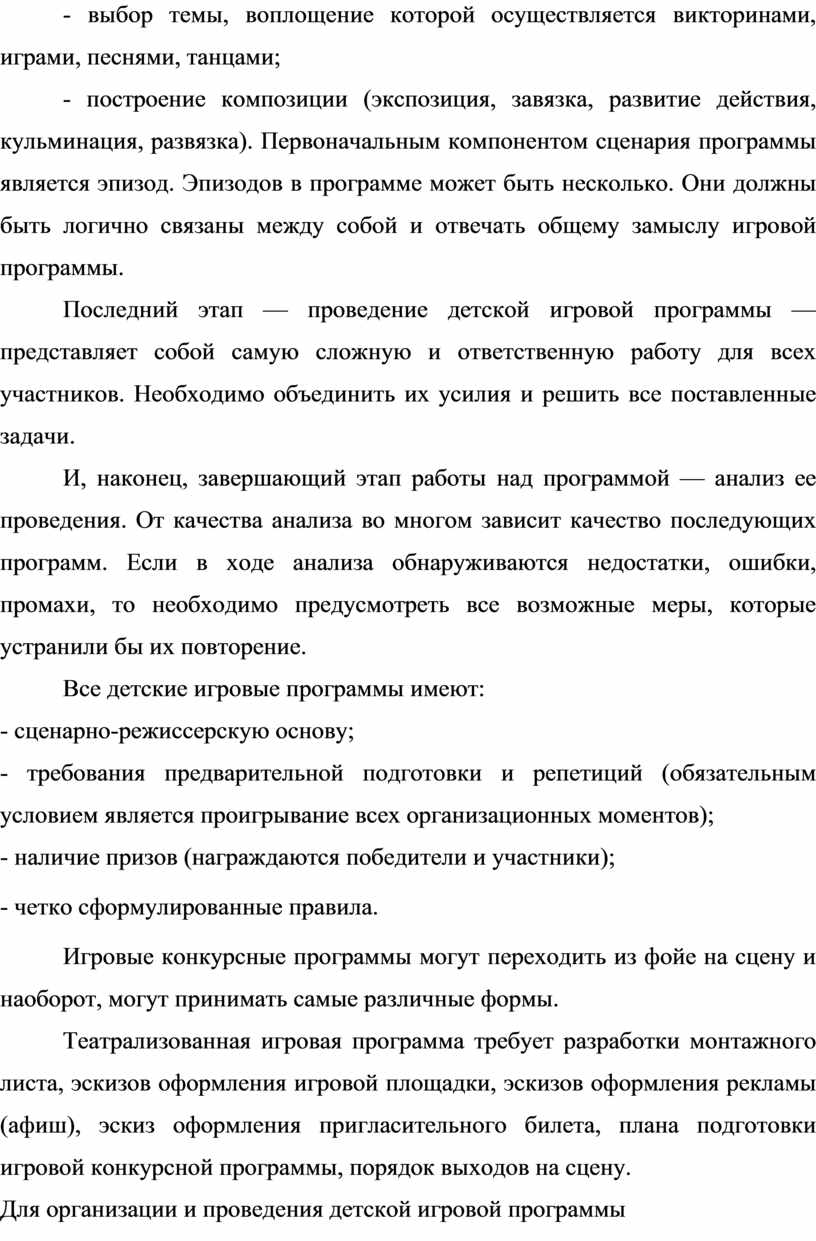 Для организации и проведения детской игровой программы необходимо знать сценарные основы, а также основы режиссуры массовых праздников и зрелищ. Правильно спланированная, организованная и проведенная игровая программа является не только интересным и содержательным «времяпровождением», но и эффективным средством формирования личности детей.