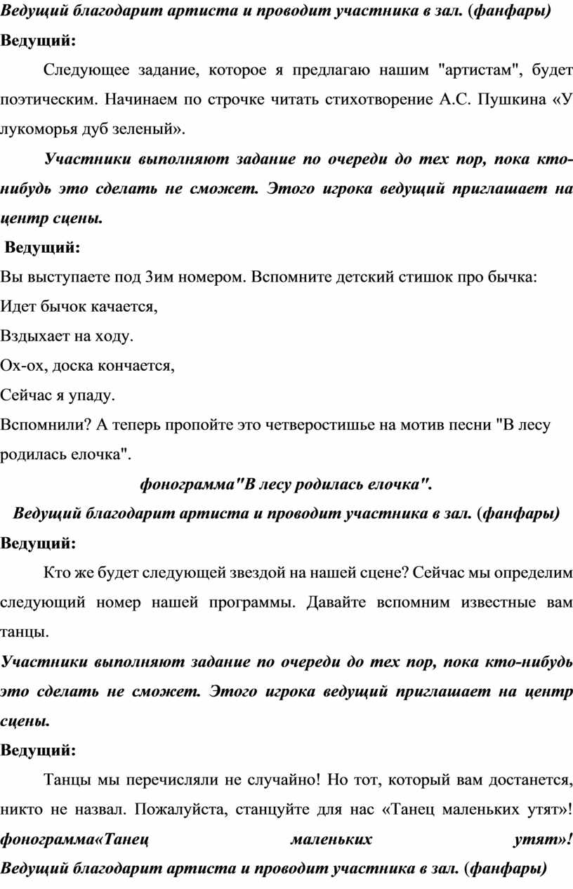 Участники выполняют задание по очереди до тех пор, пока кто-нибудь это сделать не сможет. Этого игрока ведущий приглашает на центр сцены.