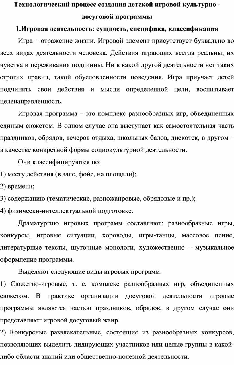 Технологический процесс создания детской игровой культурно - досуговой программы