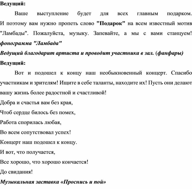 Вот и подошел к концу наш необыкновенный концерт. Спасибо участникам и зрителям! Ищите в себе таланты, находите их! Пусть они делают вашу жизнь более радостной и счастливой!