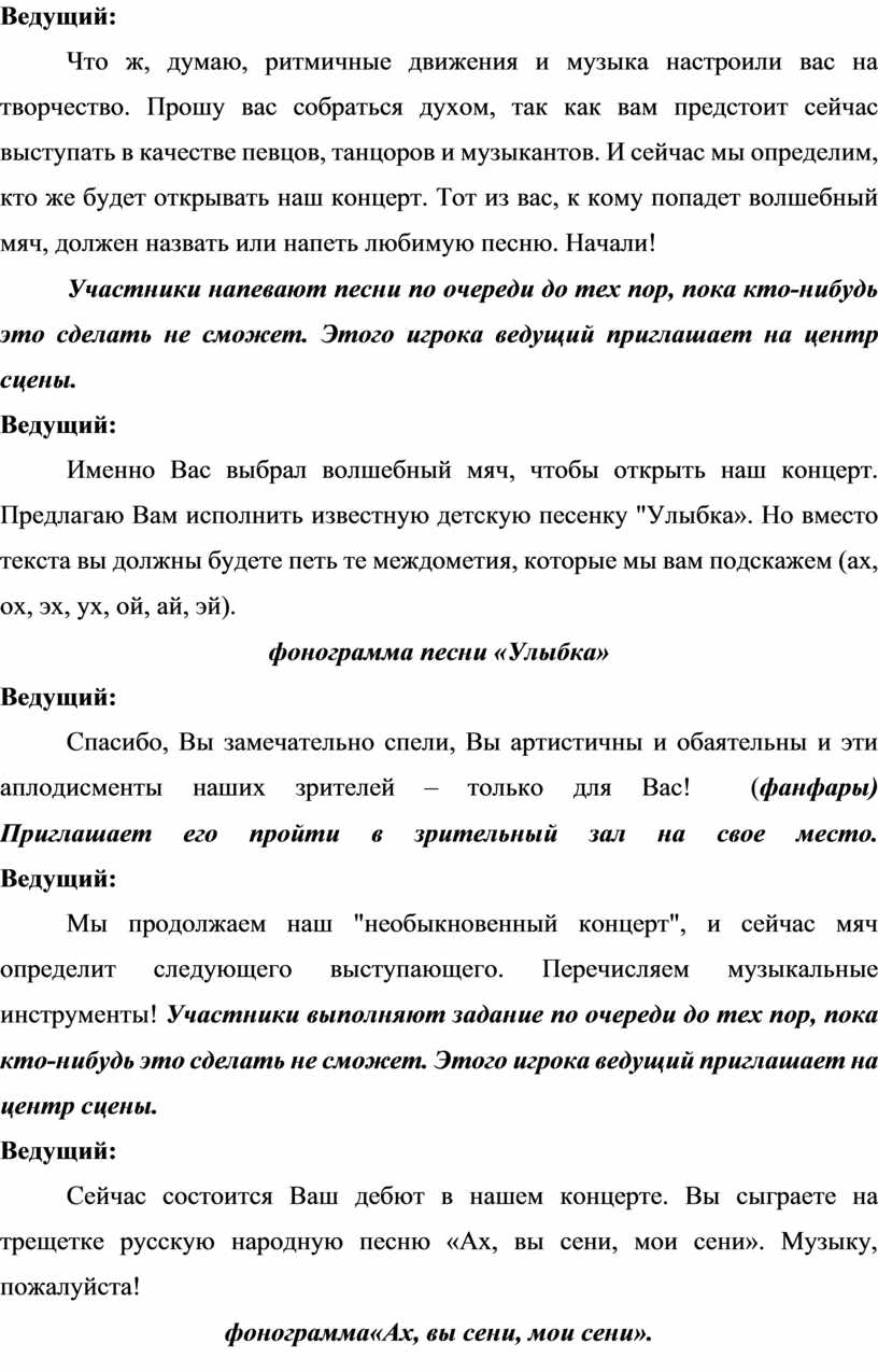 Что ж, думаю, ритмичные движения и музыка настроили вас на творчество. Прошу вас собраться духом, так как вам предстоит сейчас выступать в качестве певцов, танцоров и музыкантов. И сейчас мы определим, кто же будет открывать наш концерт. Тот из вас, к кому попадет волшебный мяч, должен назвать или напеть любимую песню. Начали!