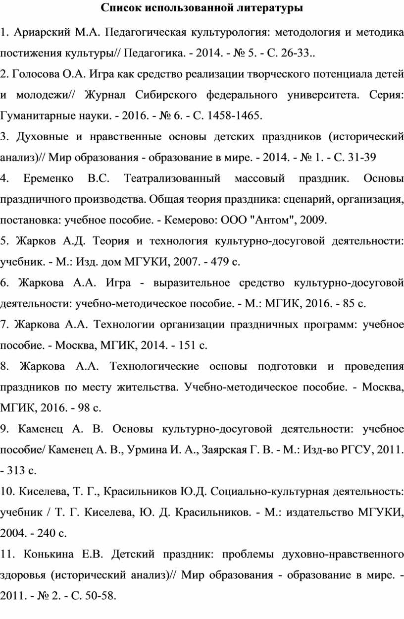 1. Ариарский М.А. Педагогическая культурология: методология и методика постижения культуры// Педагогика. - 2014. - № 5. - С. 26-33..