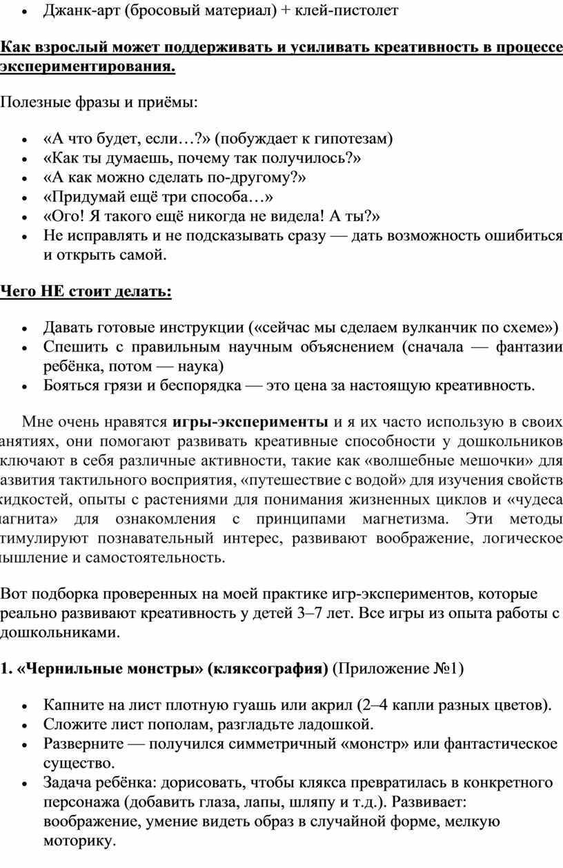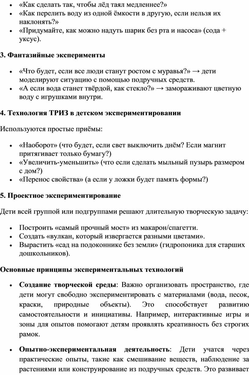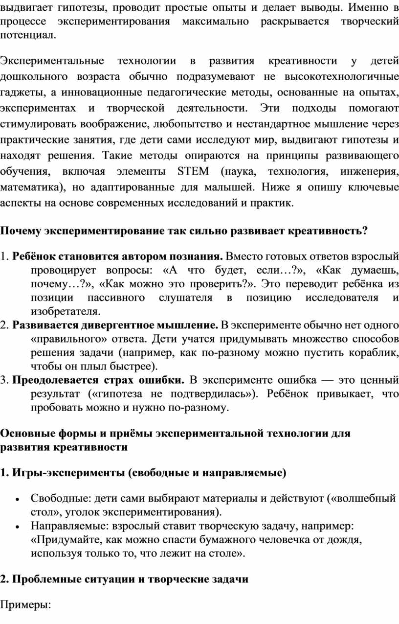 Экспериментальные технологии в развития креативности у детей дошкольного возраста обычно подразумевают не высокотехнологичные гаджеты, а инновационные педагогические методы, основанные на опытах, экспериментах и творческой деятельности. Эти подходы помогают стимулировать воображение, любопытство и нестандартное мышление через практические занятия, где дети сами исследуют мир, выдвигают гипотезы и находят решения. Такие методы опираются на принципы развивающего обучения, включая элементы STEM (наука, технология, инженерия, математика), но адаптированные для малышей. Ниже я опишу ключевые аспекты на основе современных исследований и практик.