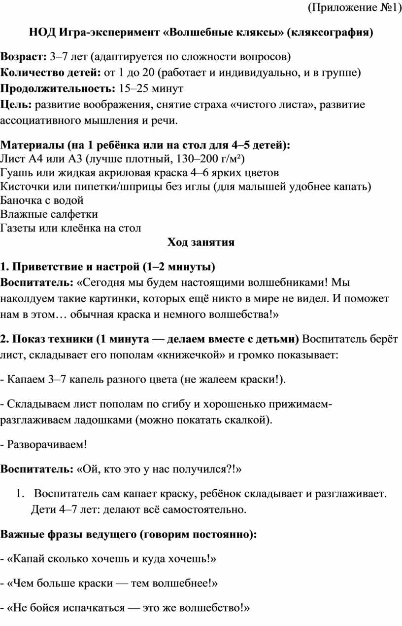 1. Приветствие и настрой (1–2 минуты) Воспитатель: «Сегодня мы будем настоящими волшебниками! Мы наколдуем такие картинки, которых ещё никто в мире не видел. И поможет нам в этом… обычная краска и немного волшебства!»