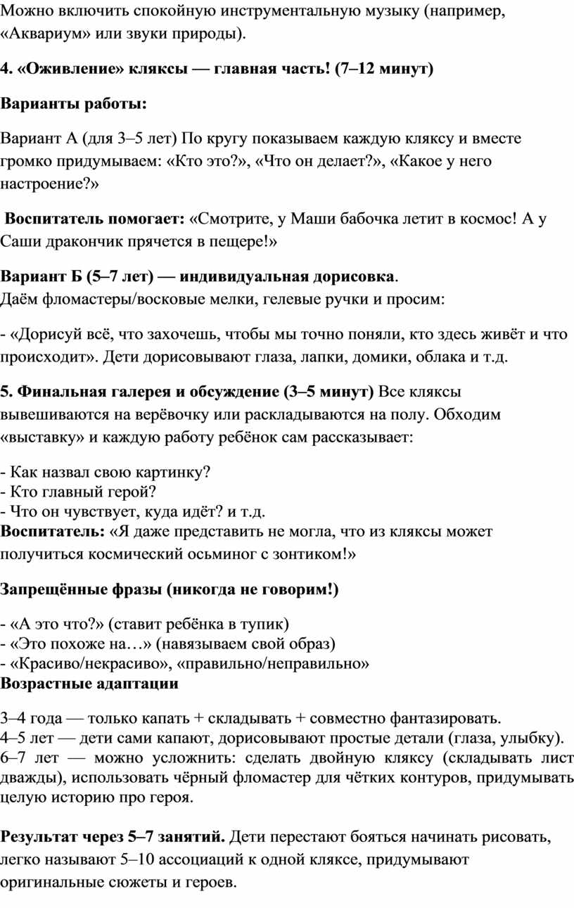 6–7 лет — можно усложнить: сделать двойную кляксу (складывать лист дважды), использовать чёрный фломастер для чётких контуров, придумывать целую историю про героя.