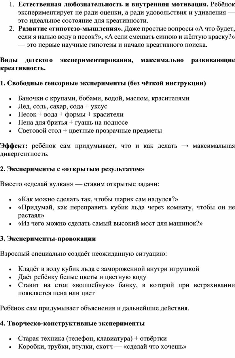 Чем больше ребёнок дошкольного возраста имеет возможности свободно и безопасно экспериментировать с материалами, веществами, звуками, светом и конструкциями — тем выше будет его творческий потенциал в будущем.