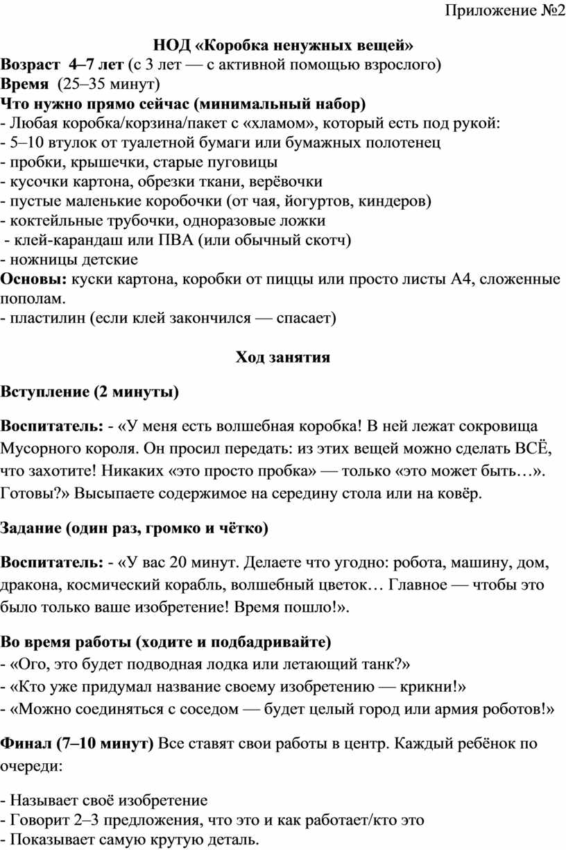 Воспитатель: - «У меня есть волшебная коробка! В ней лежат сокровища Мусорного короля. Он просил передать: из этих вещей можно сделать ВСЁ, что захотите! Никаких «это просто пробка» — только «это может быть…». Готовы?» Высыпаете содержимое на середину стола или на ковёр.