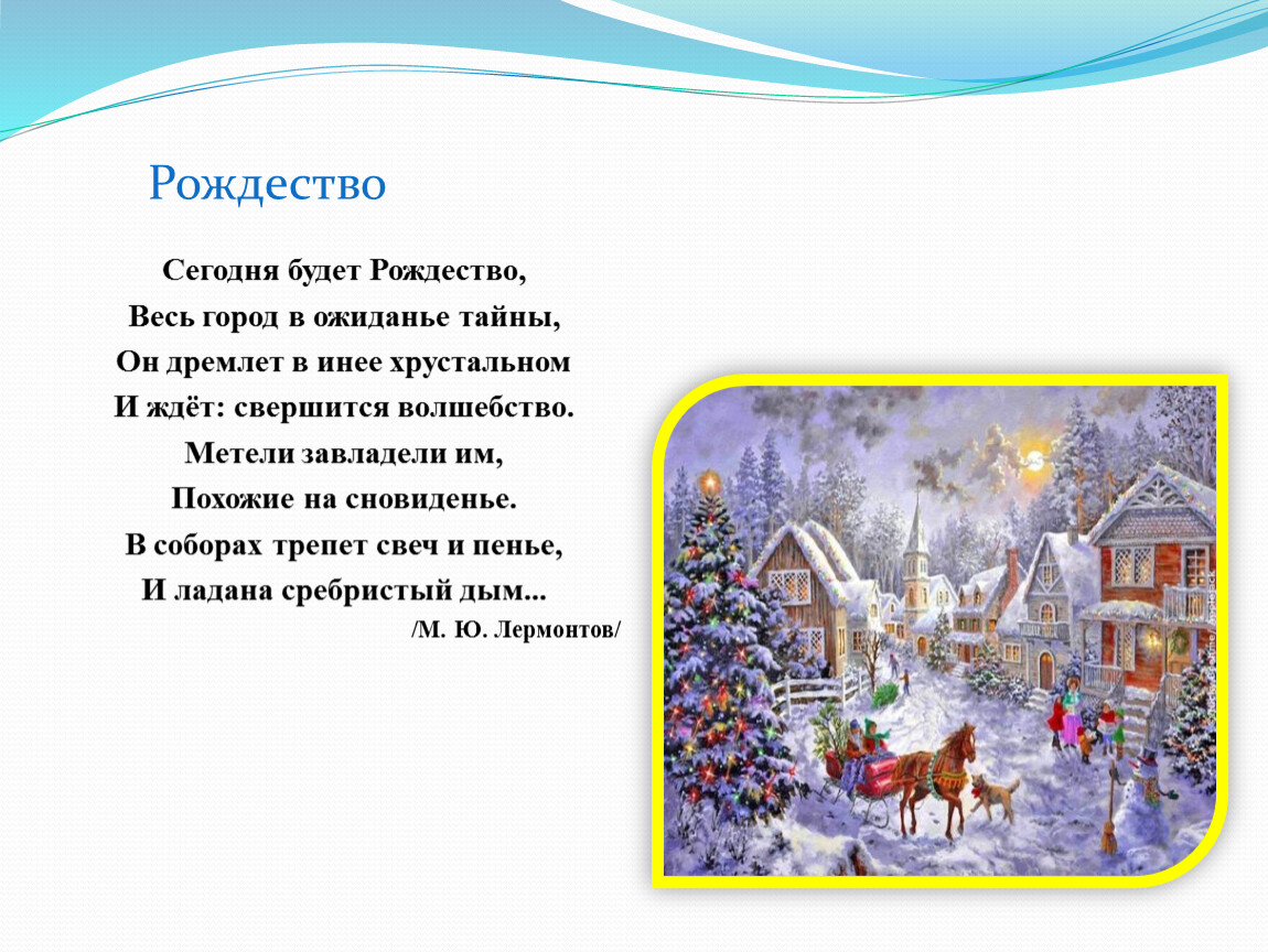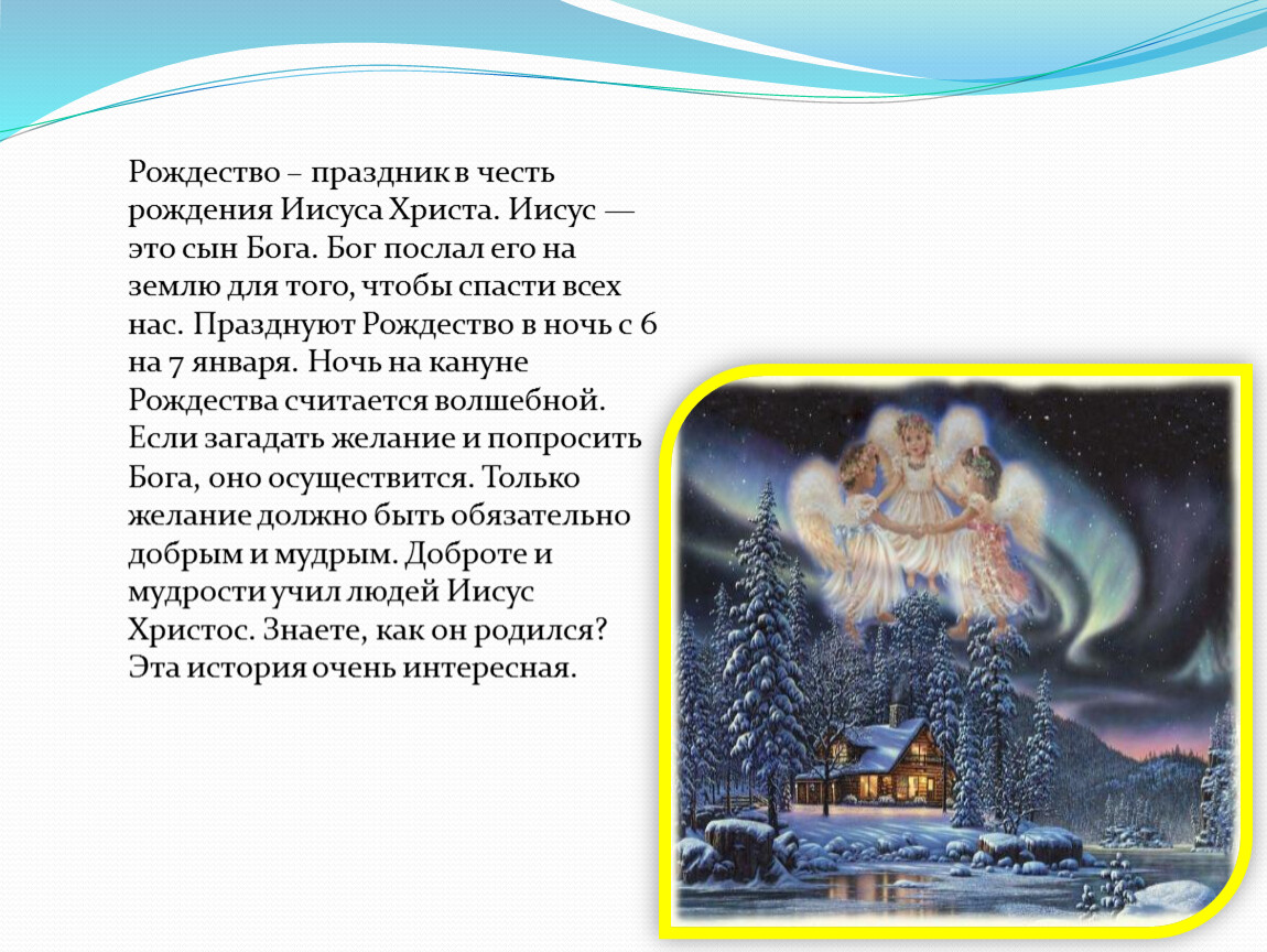Рождество – праздник в честь рождения Иисуса Христа. Иисус — это сын Бога. Бог послал его на землю для того, чтобы спасти всех нас. Празднуют Рождество в ночь с 6 на 7 января. Ночь на кануне Рождества считается волшебной. Если загадать желание и попросить Бога, оно осуществится. Только желание должно быть обязательно добрым и мудрым. Доброте и мудрости учил людей Иисус Христос. Знаете, как он родился? Эта история очень интересная.