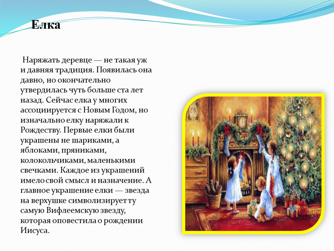 Наряжать деревце — не такая уж и давняя традиция. Появилась она давно, но окончательно утвердилась чуть больше ста лет назад. Сейчас елка у многих ассоциируется с Новым Годом, но изначально елку наряжали к Рождеству. Первые елки были украшены не шариками, а яблоками, пряниками, колокольчиками, маленькими свечками. Каждое из украшений имело свой смысл и назначение. А главное украшение елки — звезда на верхушке символизирует ту самую Вифлеемскую звезду, которая оповестила о рождении Иисуса.