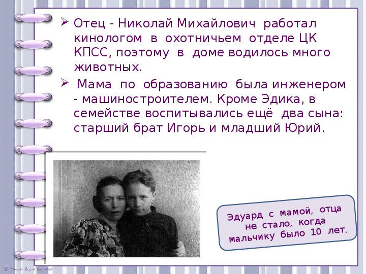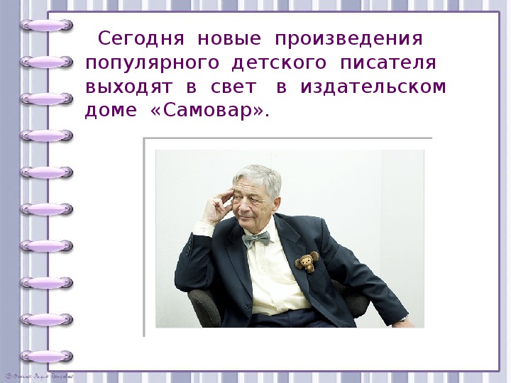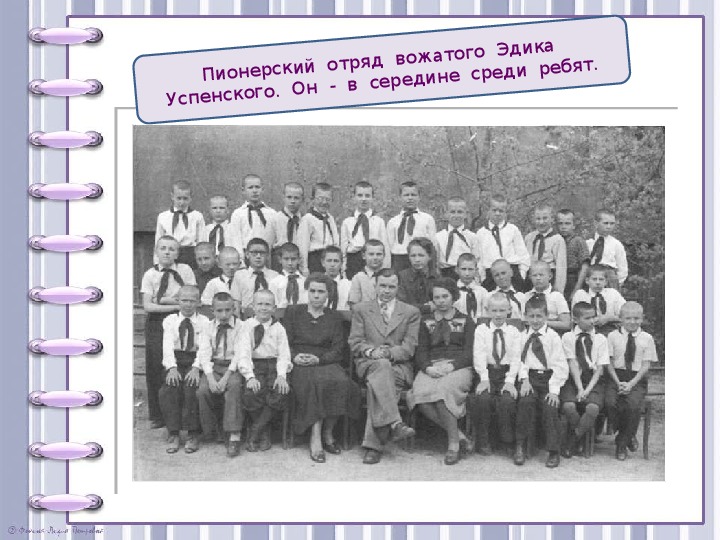Презентация к урокам литературного чтения в начальных классах по УМК "Школа России" знакомит обучающихся с жизнью и творчеством писателя Э. Н. Успенского. Содержатся фотографии из архивов и воспоминаний. Может быть использована информация презентации выборочно в зависимости от класса и изучаемого произведения.Презентация к урокам литературного чтения в начальных классах