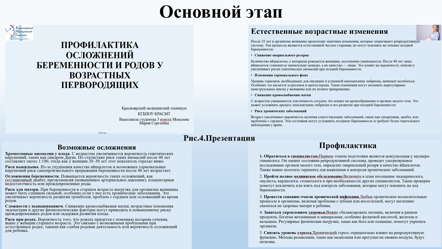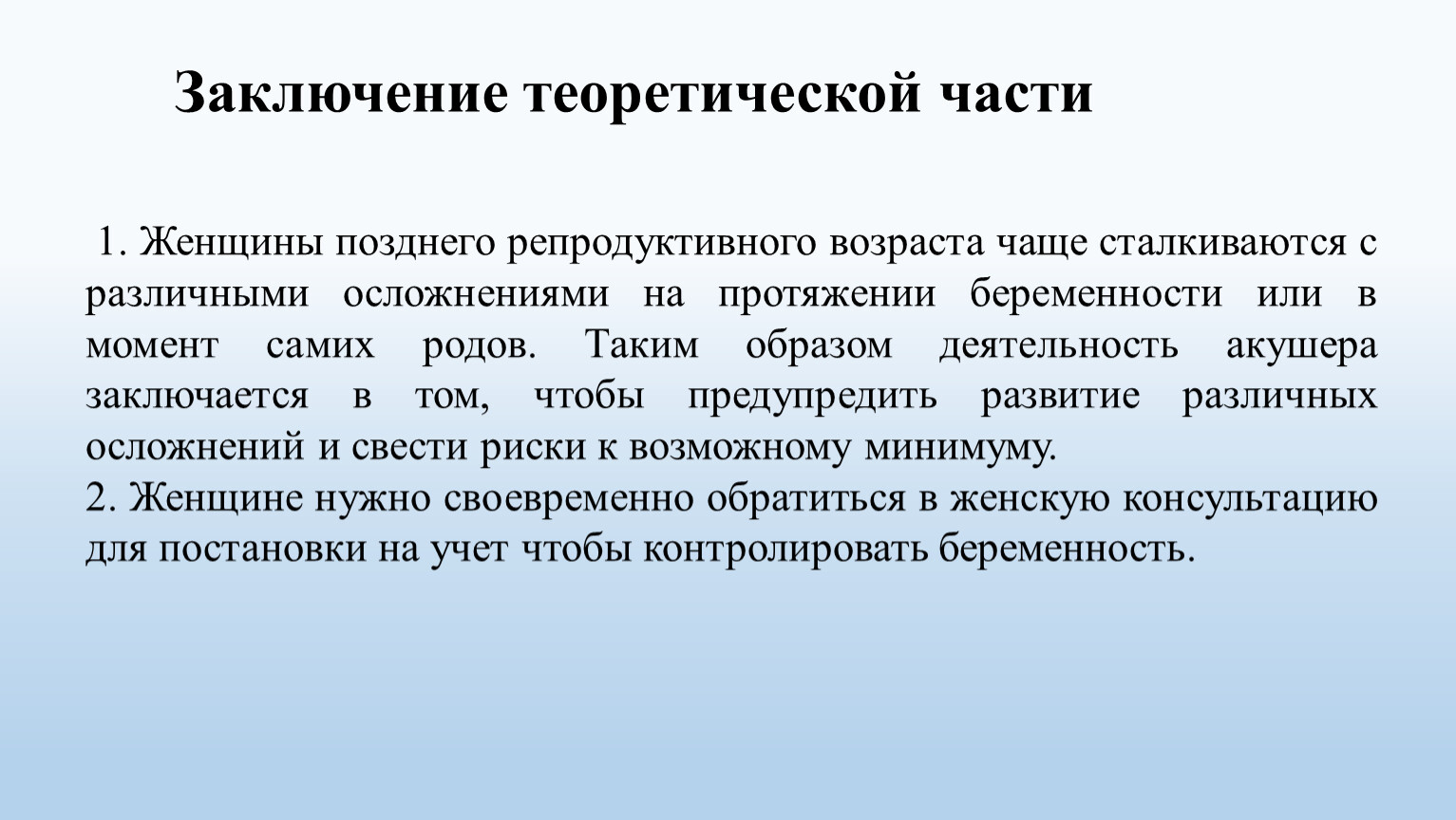 1. Женщины позднего репродуктивного возраста чаще сталкиваются с различными осложнениями на протяжении беременности или в момент самих родов. Таким образом деятельность акушера заключается в том, чтобы предупредить развитие различных осложнений и свести риски к возможному минимуму.