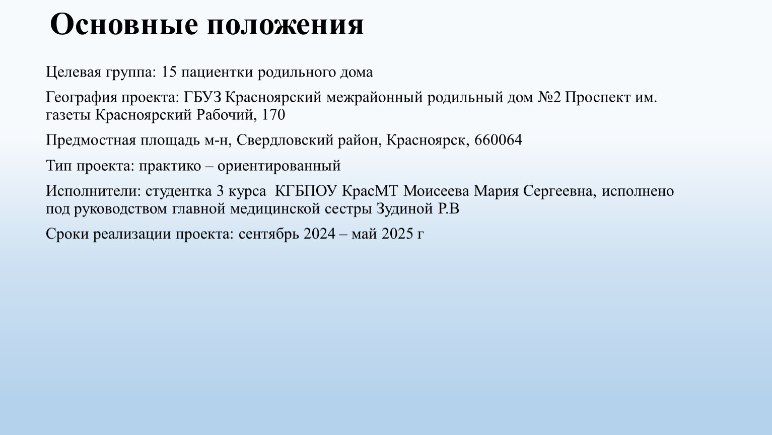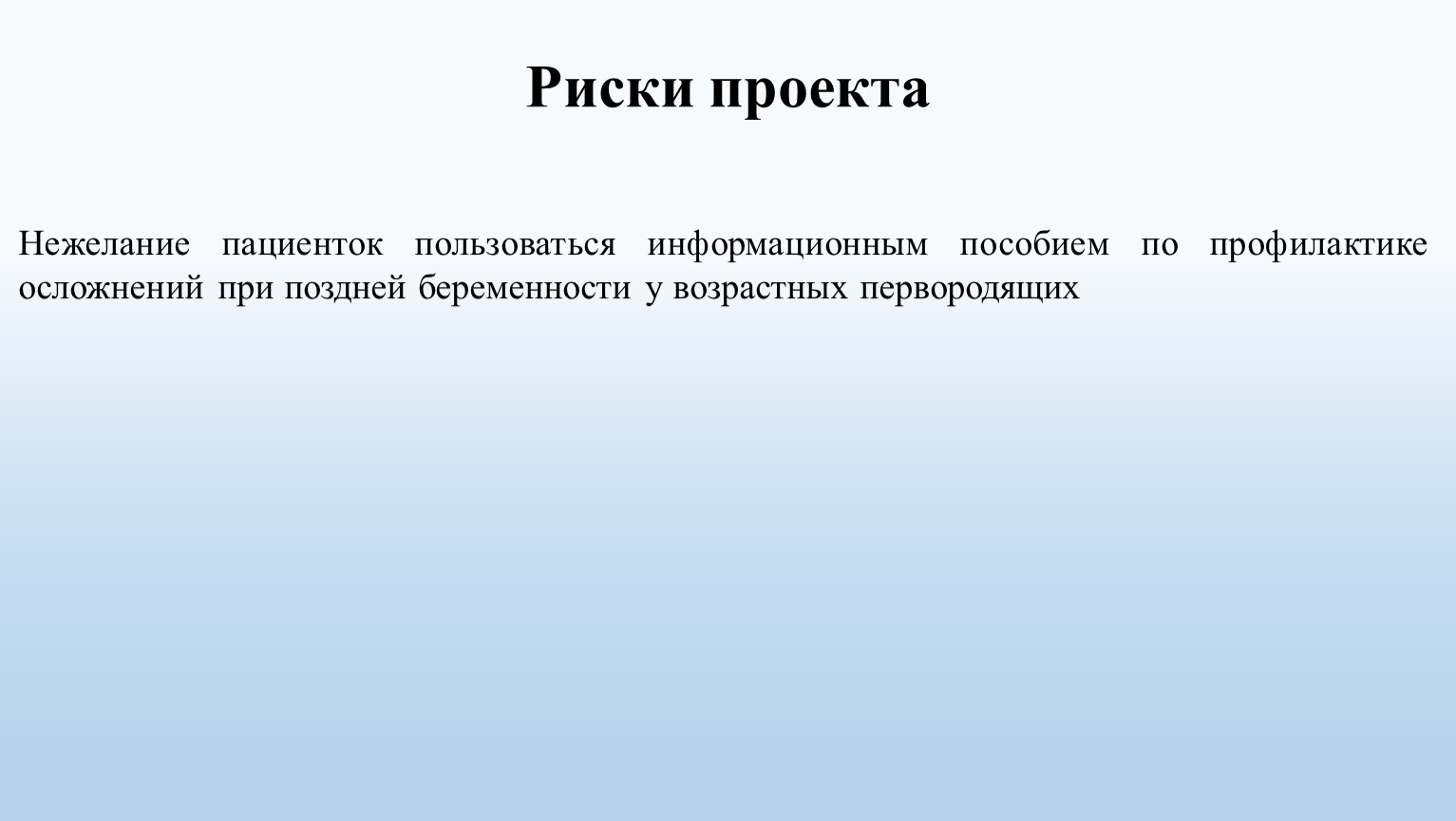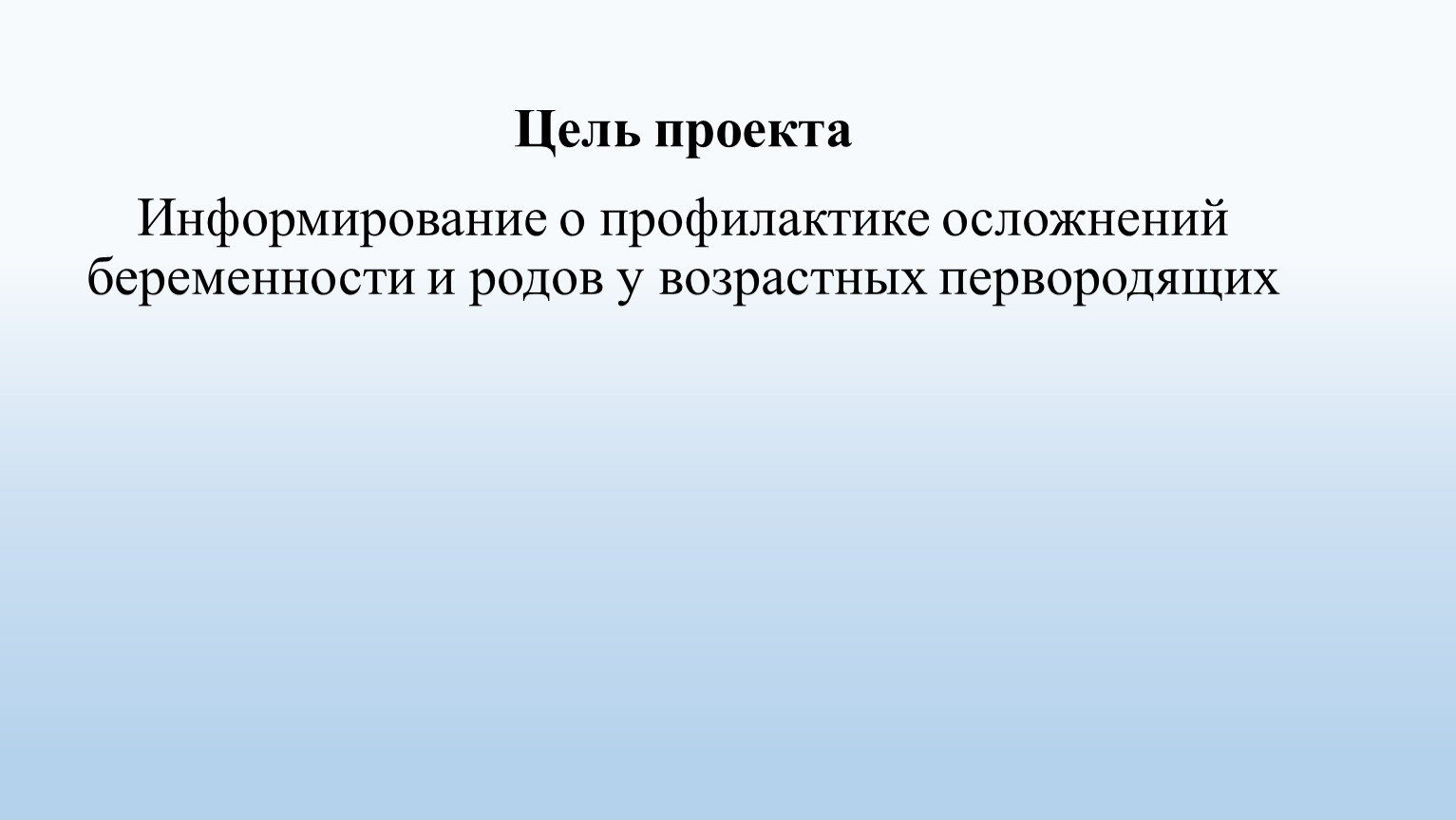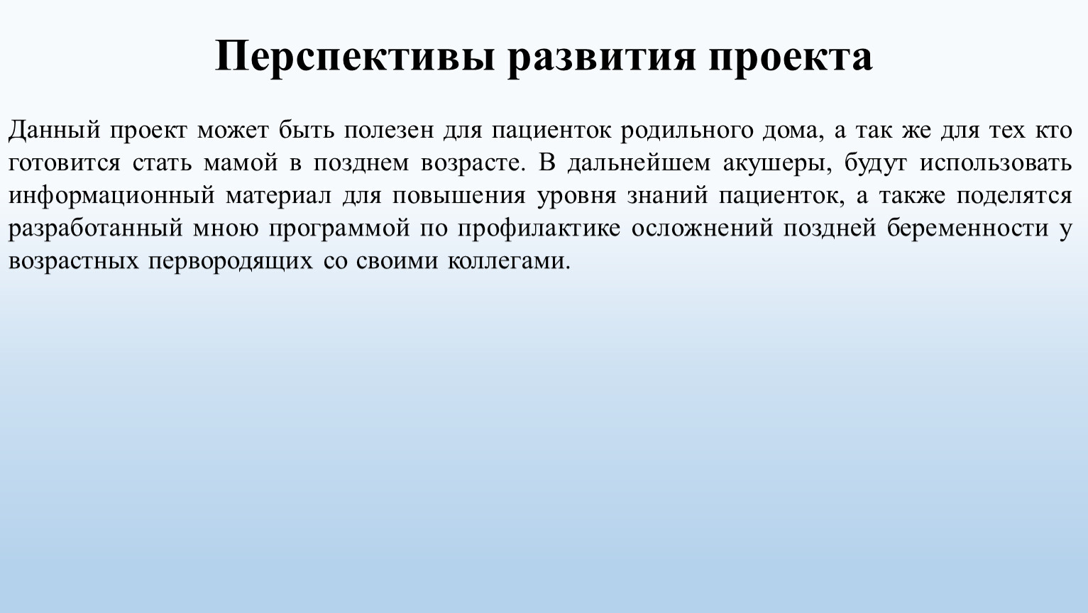Данный проект может быть полезен для пациенток родильного дома, а так же для тех кто готовится стать мамой в позднем возрасте. В дальнейшем акушеры, будут использовать информационный материал для повышения уровня знаний пациенток, а также поделятся разработанный мною программой по профилактике осложнений поздней беременности у возрастных первородящих со своими коллегами.