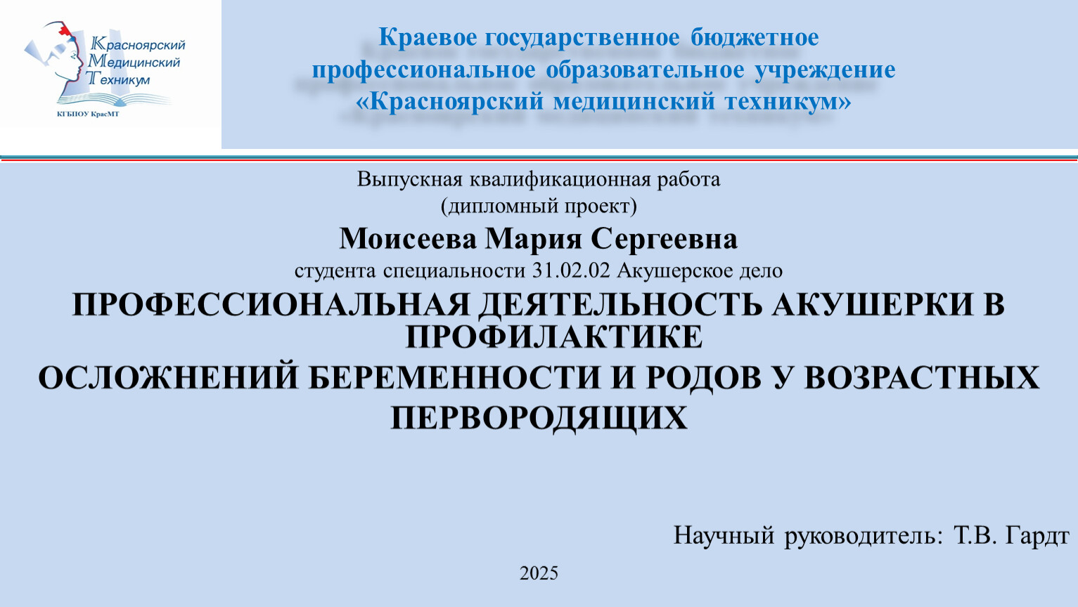 Исполнители: студентка 3 курса КГБПОУ КрасМТ Моисеева Мария Сергеевна, исполнено под руководством главной медицинской сестры Зудиной Р.В