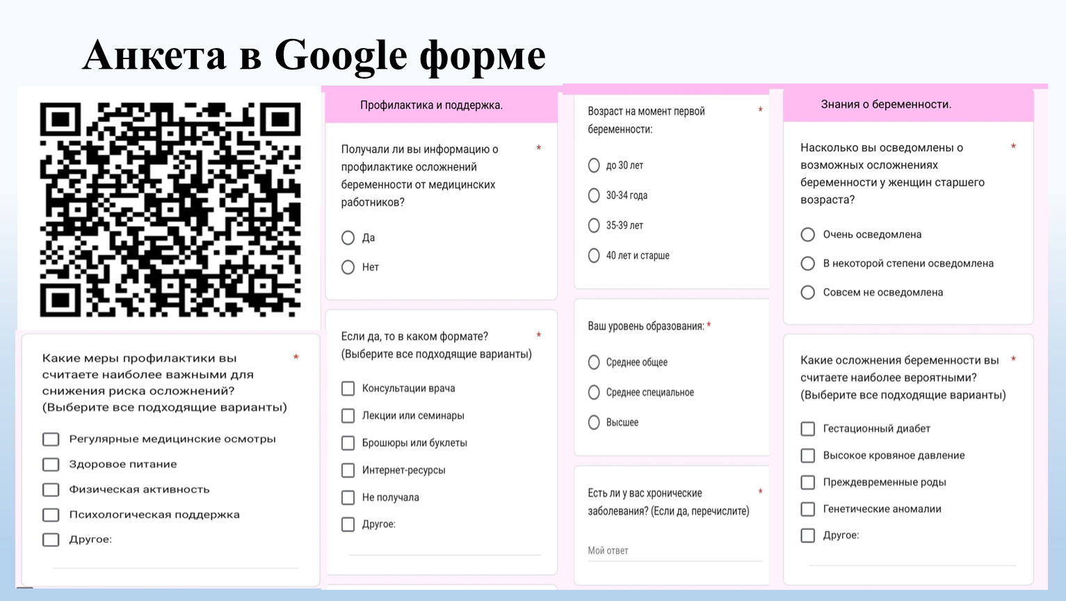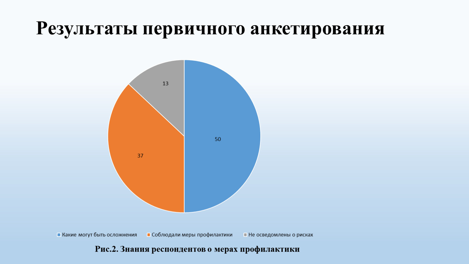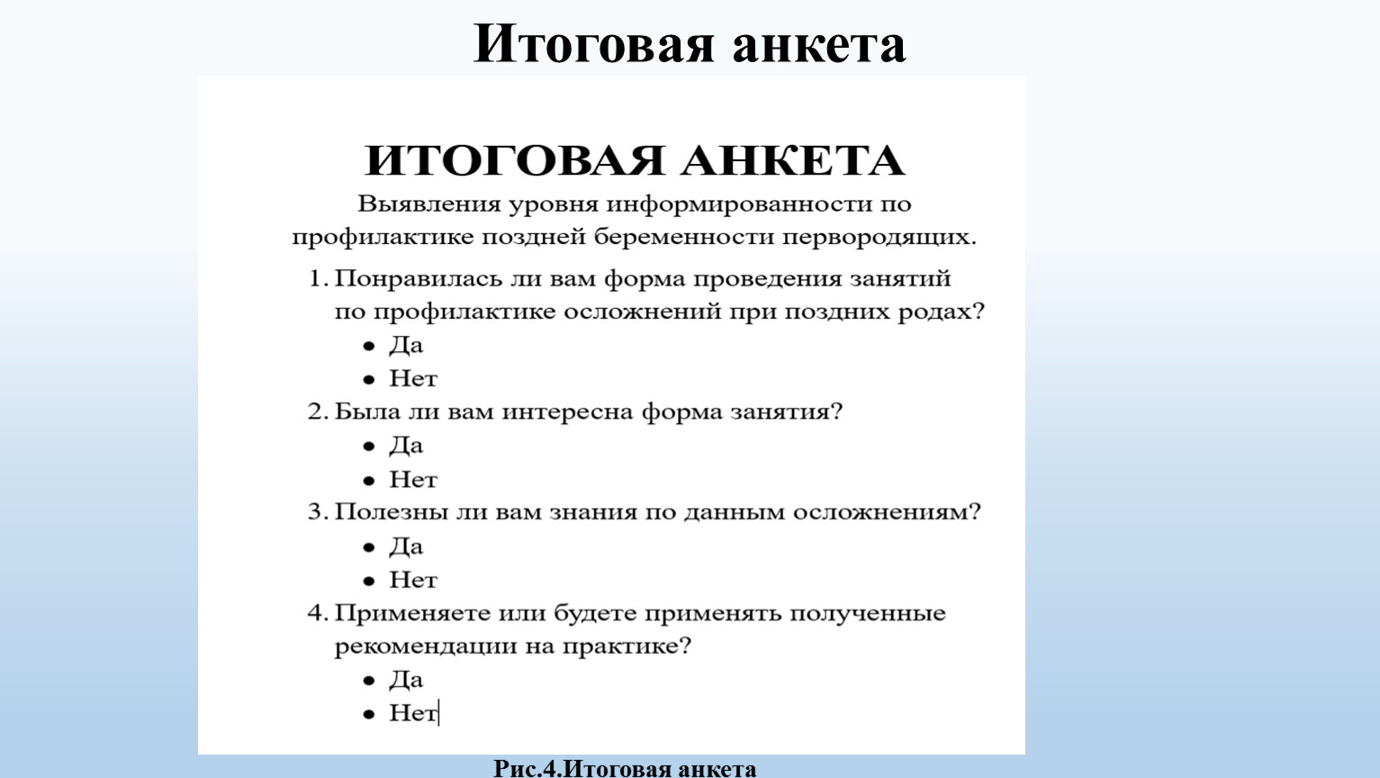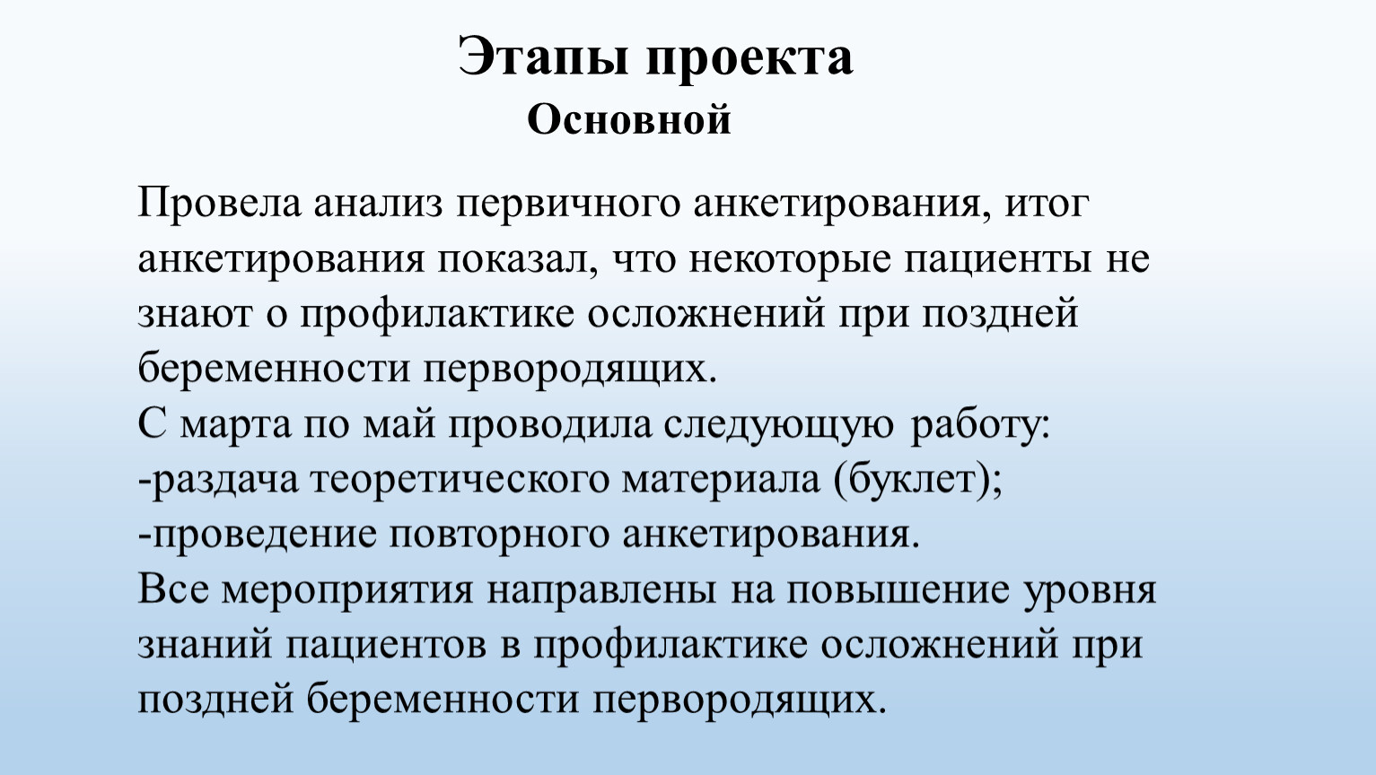 Провела анализ первичного анкетирования, итог анкетирования показал, что некоторые пациенты не знают о профилактике осложнений при поздней беременности первородящих.
