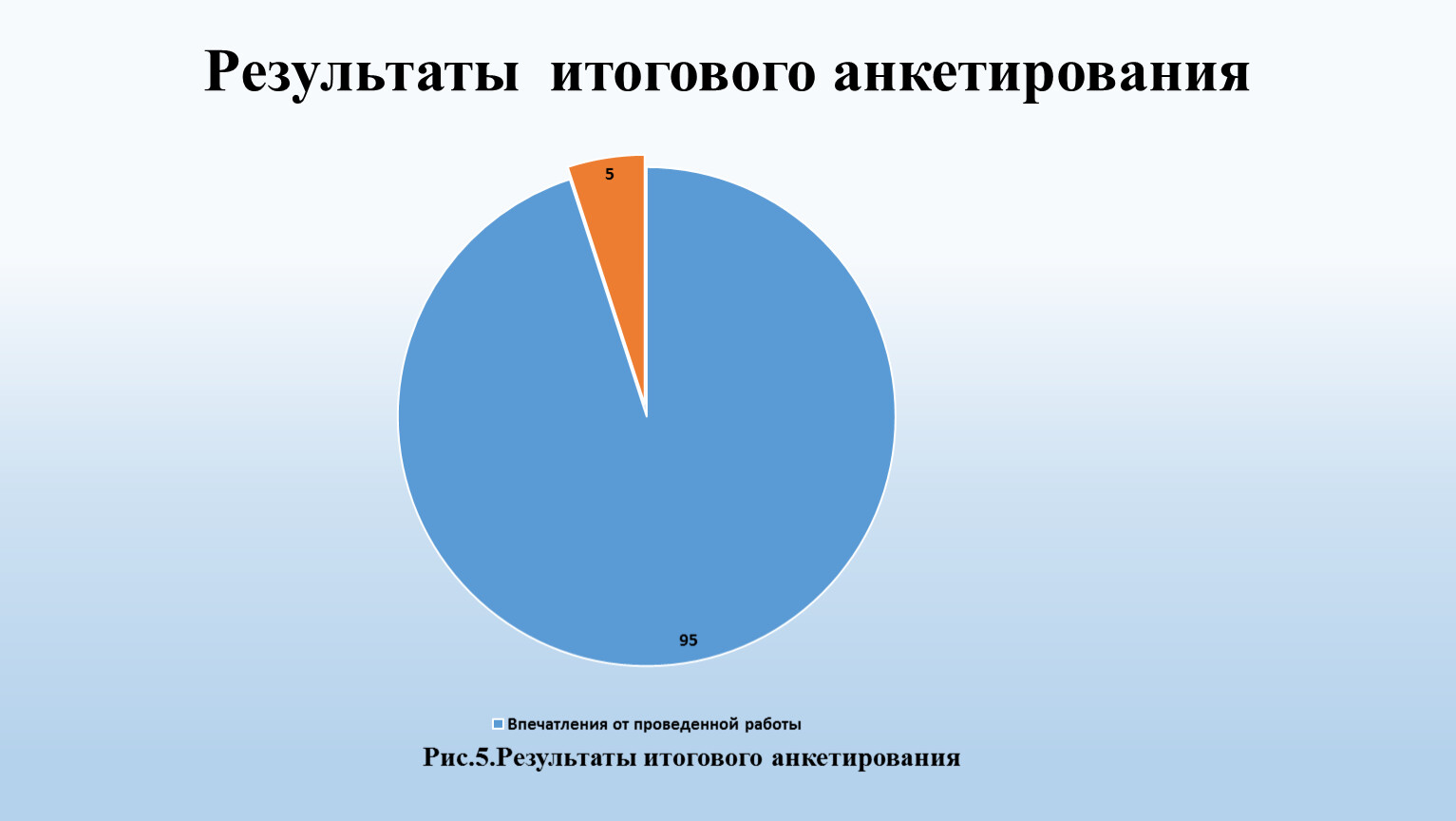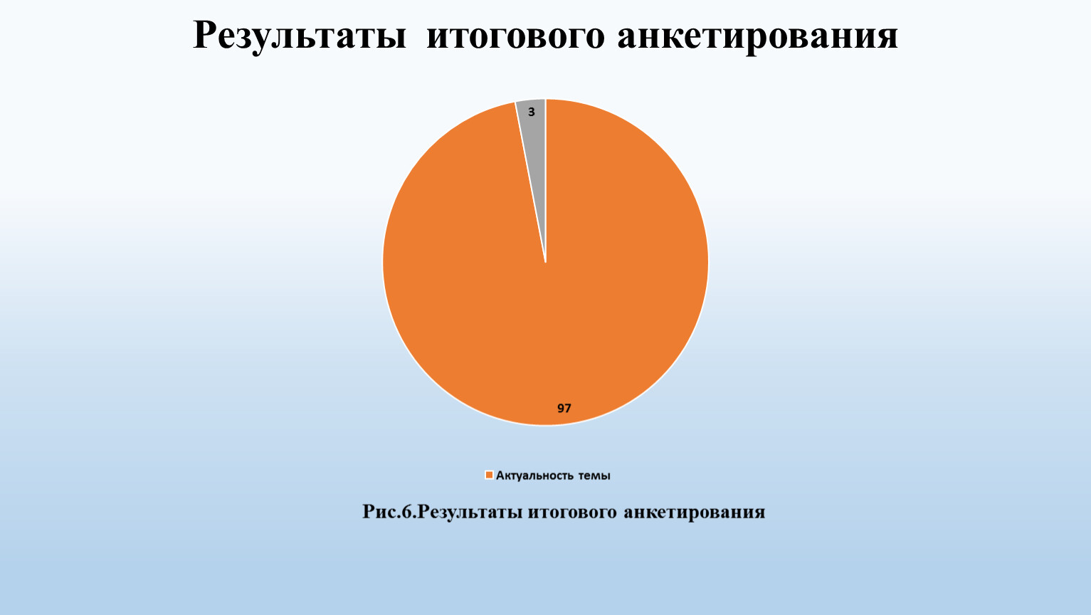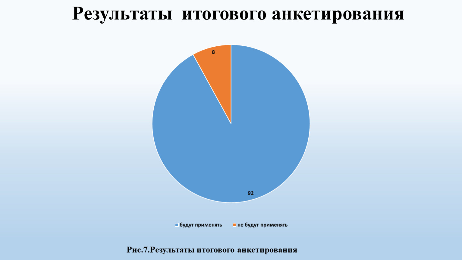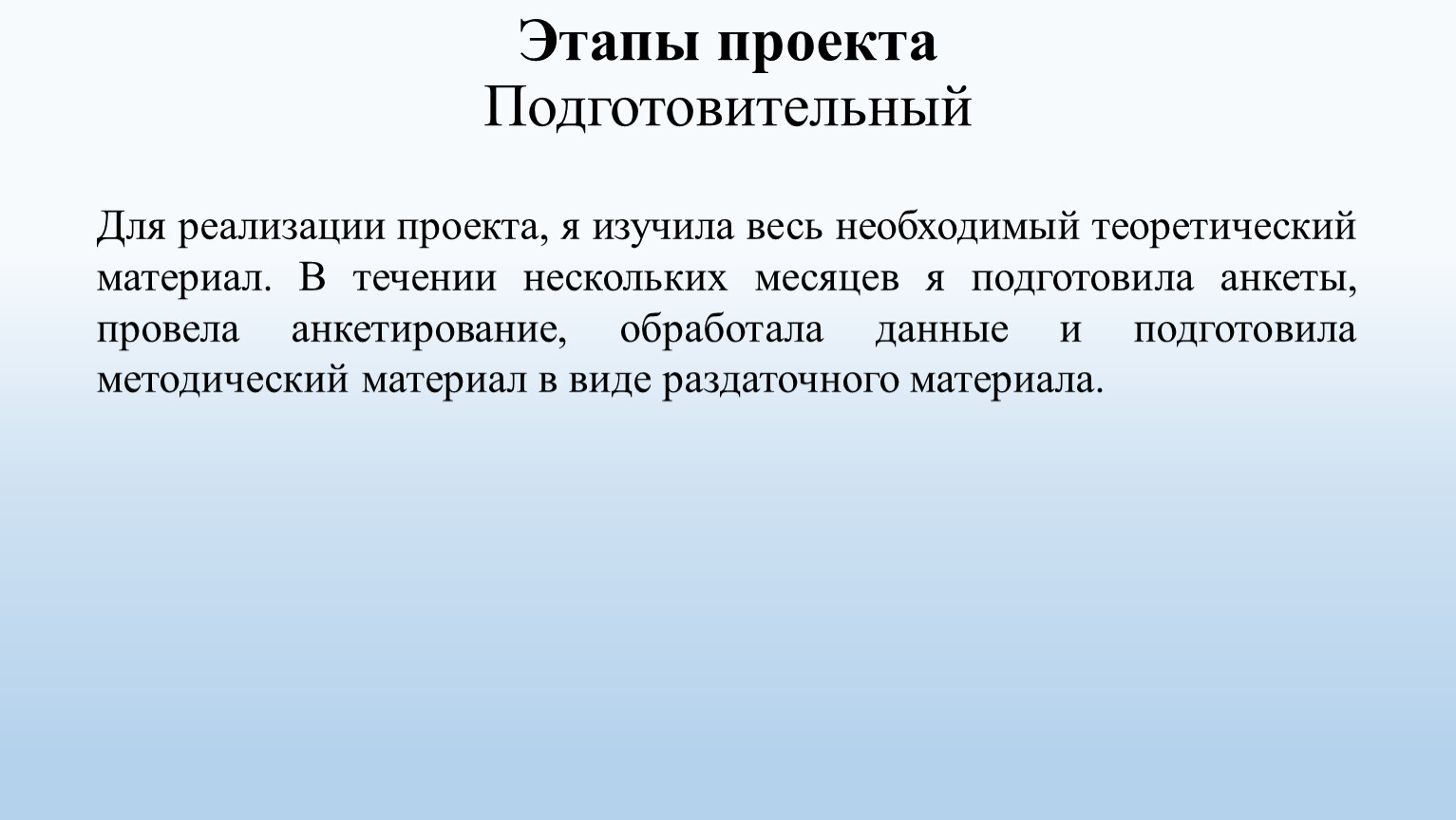 Для реализации проекта, я изучила весь необходимый теоретический материал. В течении нескольких месяцев я подготовила анкеты, провела анкетирование, обработала данные и подготовила методический материал в виде раздаточного материала.