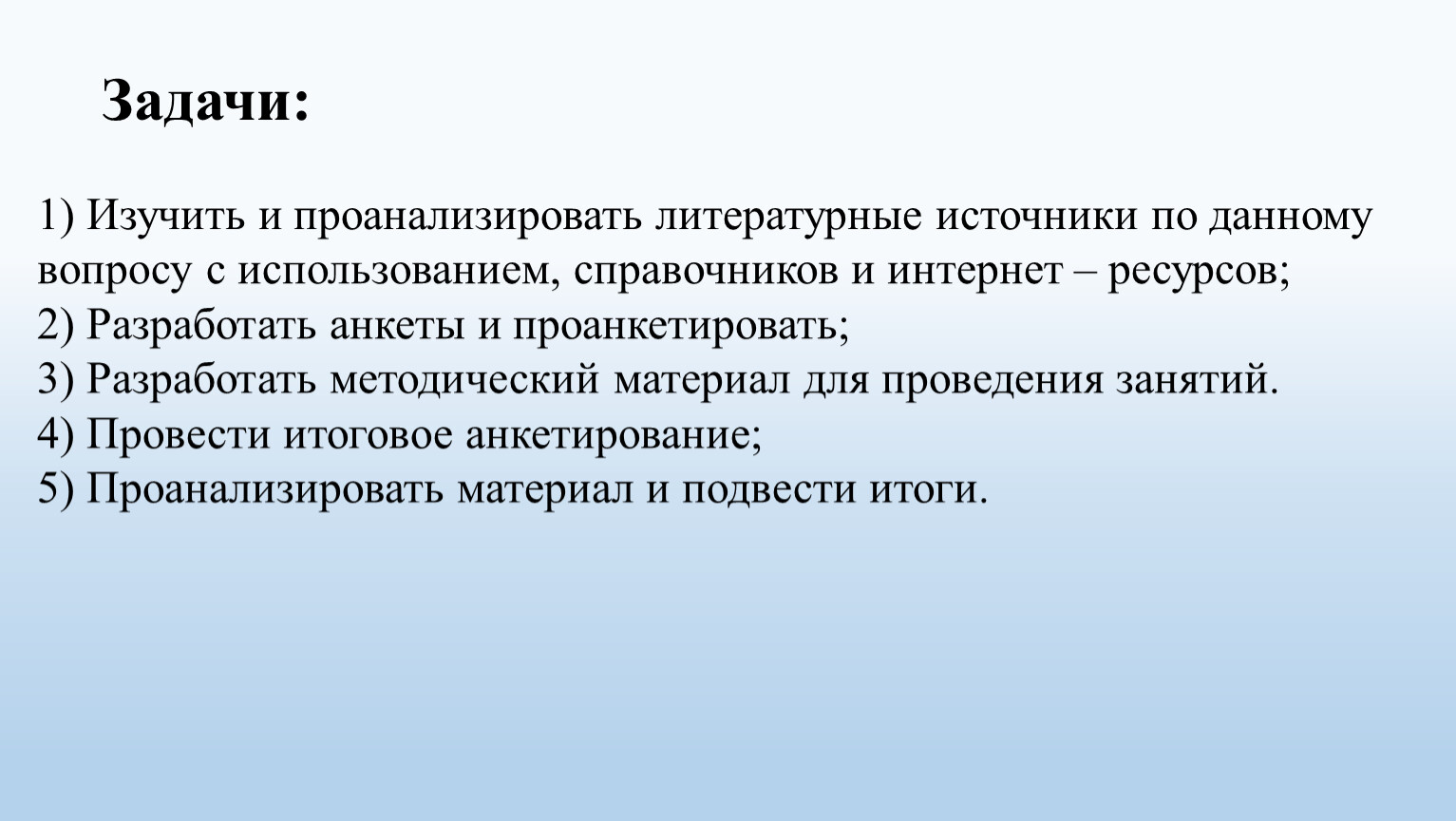 Задачи:1) Изучить и проанализировать литературные источники по данному вопросу с использованием, справочников и интернет – ресурсов;2) Разработать анкеты и проанкетировать; 3) Разработать методический материал для проведения занятий. 4) Провести итоговое анкетирование;5) Проанализировать материал и подвести итоги.