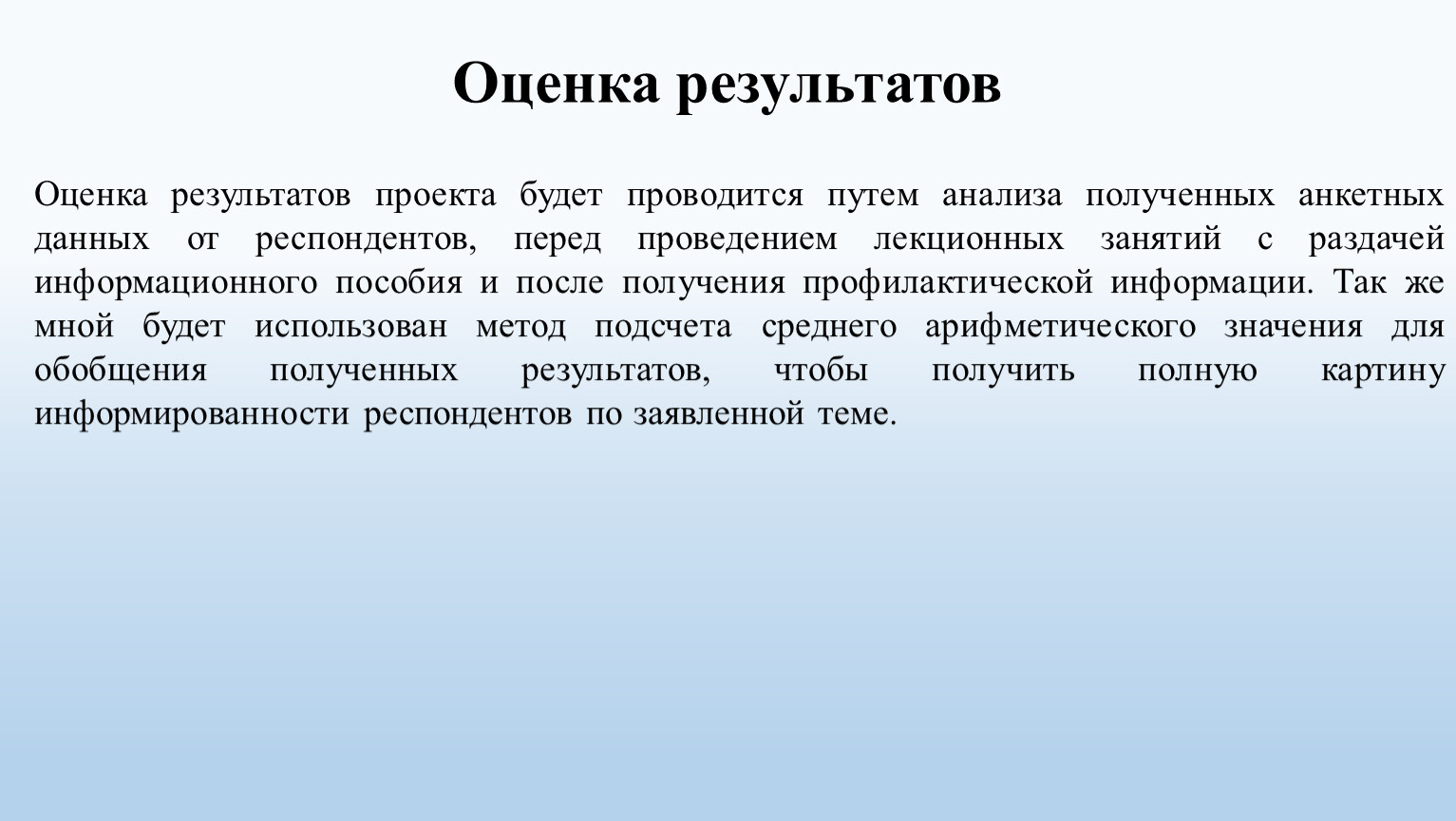 Оценка результатов проекта будет проводится путем анализа полученных анкетных данных от респондентов, перед проведением лекционных занятий с раздачей информационного пособия и после получения профилактической информации. Так же мной будет использован метод подсчета среднего арифметического значения для обобщения полученных результатов, чтобы получить полную картину информированности респондентов по заявленной теме.