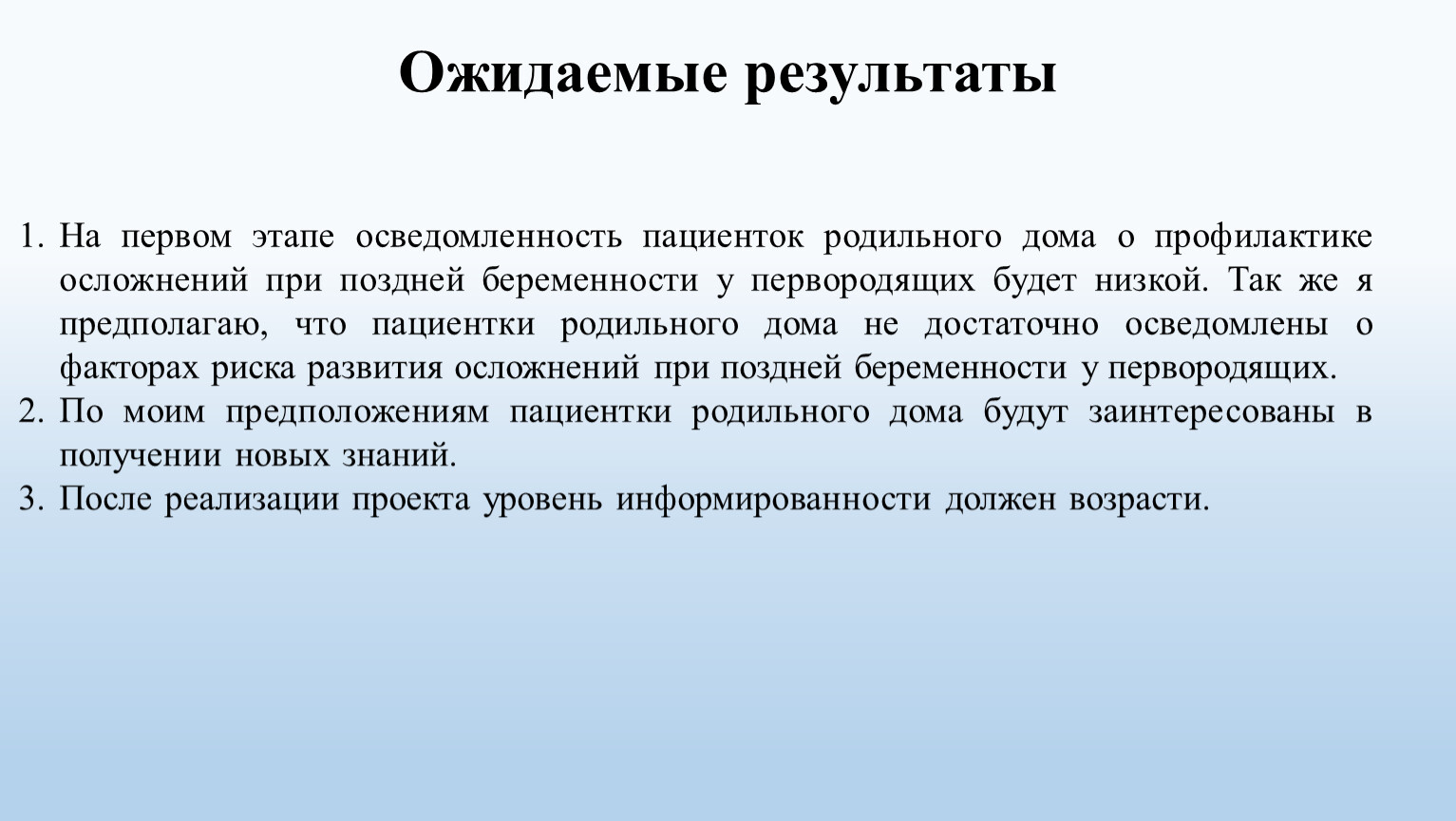 На первом этапе осведомленность пациенток родильного дома о профилактике осложнений при поздней беременности у первородящих будет низкой. Так же я предполагаю, что пациентки родильного дома не достаточно осведомлены о факторах риска развития осложнений при поздней беременности у первородящих.