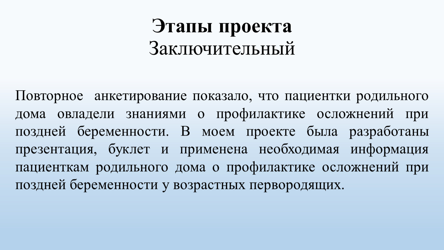 Повторное анкетирование показало, что пациентки родильного дома овладели знаниями о профилактике осложнений при поздней беременности. В моем проекте была разработаны презентация, буклет и применена необходимая информация пациенткам родильного дома о профилактике осложнений при поздней беременности у возрастных первородящих.