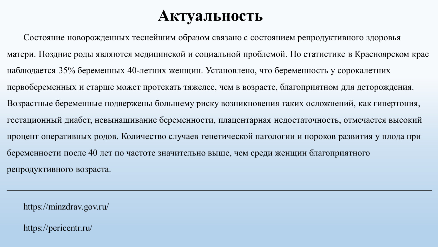 Состояние новорожденных теснейшим образом связано с состоянием репродуктивного здоровья матери. Поздние роды являются медицинской и социальной проблемой. По статистике в Красноярском крае наблюдается 35% беременных 40-летних женщин. Установлено, что беременность у сорокалетних первобеременных и старше может протекать тяжелее, чем в возрасте, благоприятном для деторождения. Возрастные беременные подвержены большему риску возникновения таких осложнений, как гипертония, гестационный диабет, невынашивание беременности, плацентарная недостаточность, отмечается высокий процент оперативных родов. Количество случаев генетической патологии и пороков развития у плода при беременности после 40 лет по частоте значительно выше, чем среди женщин благоприятного репродуктивного возраста. _____________________________________________________________________________________________