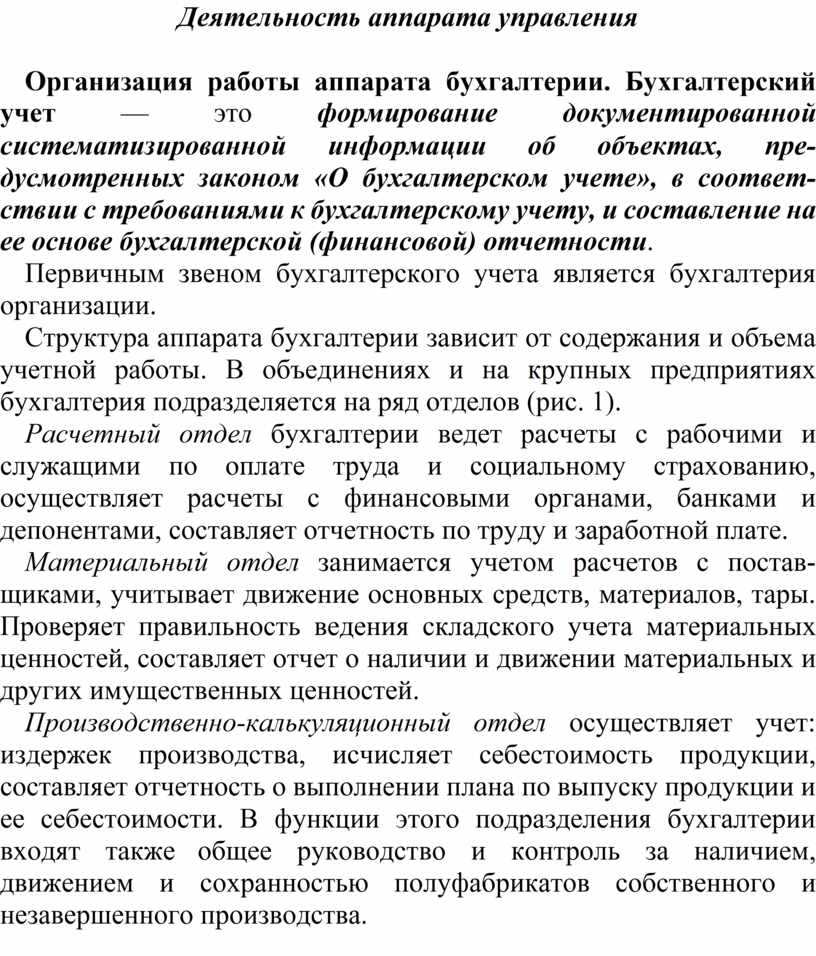 Структура аппарата бухгалтерии зависит от содержания и объема учетной работы. В объединениях и на крупных предприятиях бухгалтерия подразделяется на ряд отделов (рис. 1).
