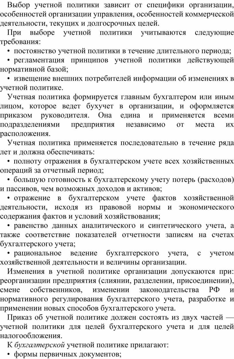 Выбор учетной политики зависит от специфики организации, особенностей организации управления, особенностей коммерческой деятельности, текущих и долгосрочных целей.