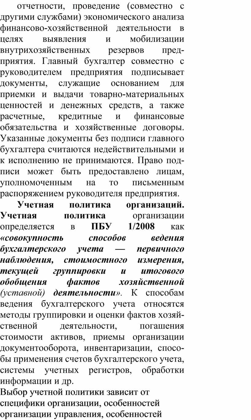 Главный бухгалтер несет ответственность за формирование учетной политики, обеспечивает контроль и отражение на счетах бухгалтерского учета хозяйственных операций, представление оперативной информации, составление в установленные сроки бухгалтерской отчетности, проведение (совместно с другими службами) экономического анализа финансово-хозяйственной деятельности в целях выявления и мобилизации внутрихозяйственных резервов предприятия. Главный бухгалтер совместно с руководителем предприятия подписывает документы, служащие основанием для приемки и выдачи товарно-материальных ценностей и денежных средств, а также расчетные, кредитные и финансовыe обязательства и хозяйственные договоры. Указанные документы без подписи главного бухгалтера считаются недействительными и к исполнению не принимаются. Право подписи может быть предоставлено лицам, уполномоченным на то письменным распоряжением руководителя предприятия.