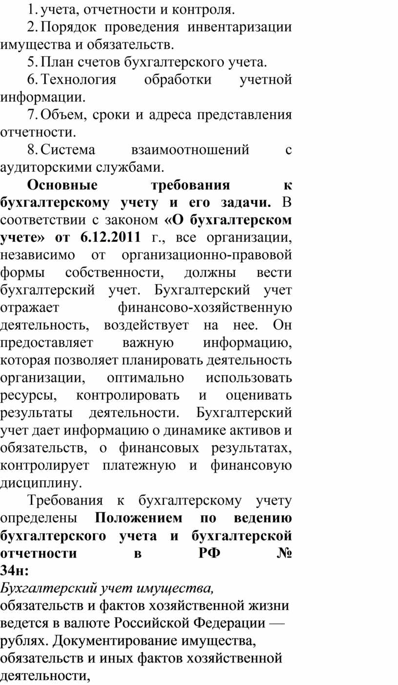 Требования к бухгалтерскому учету определены Положением по ведению бухгалтерского учета и бухгалтерской отчетности в РФ № 34н: