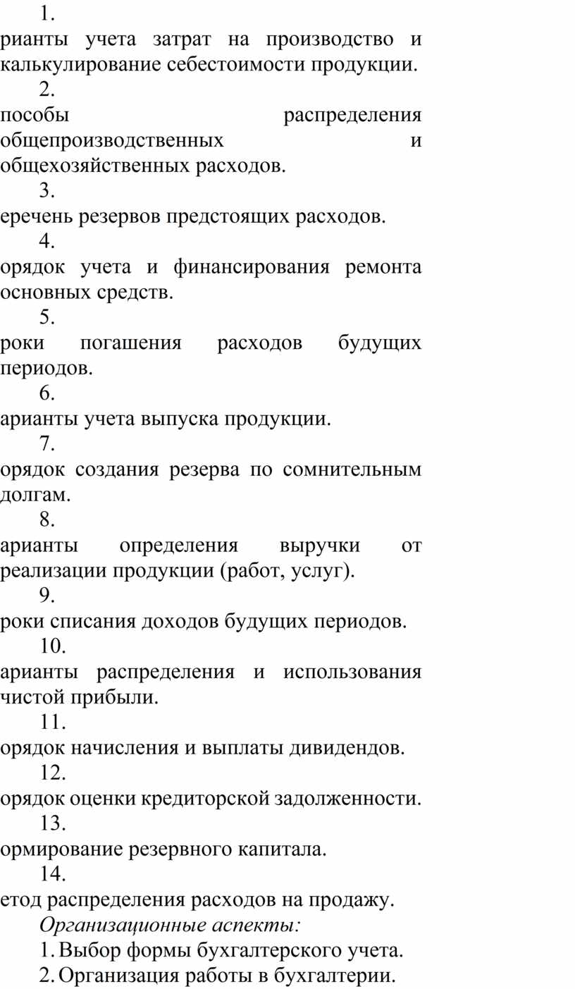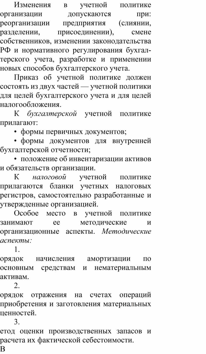 Особое место в учетной политике занимают ее методические и организационные аспекты. Методические аспекты: